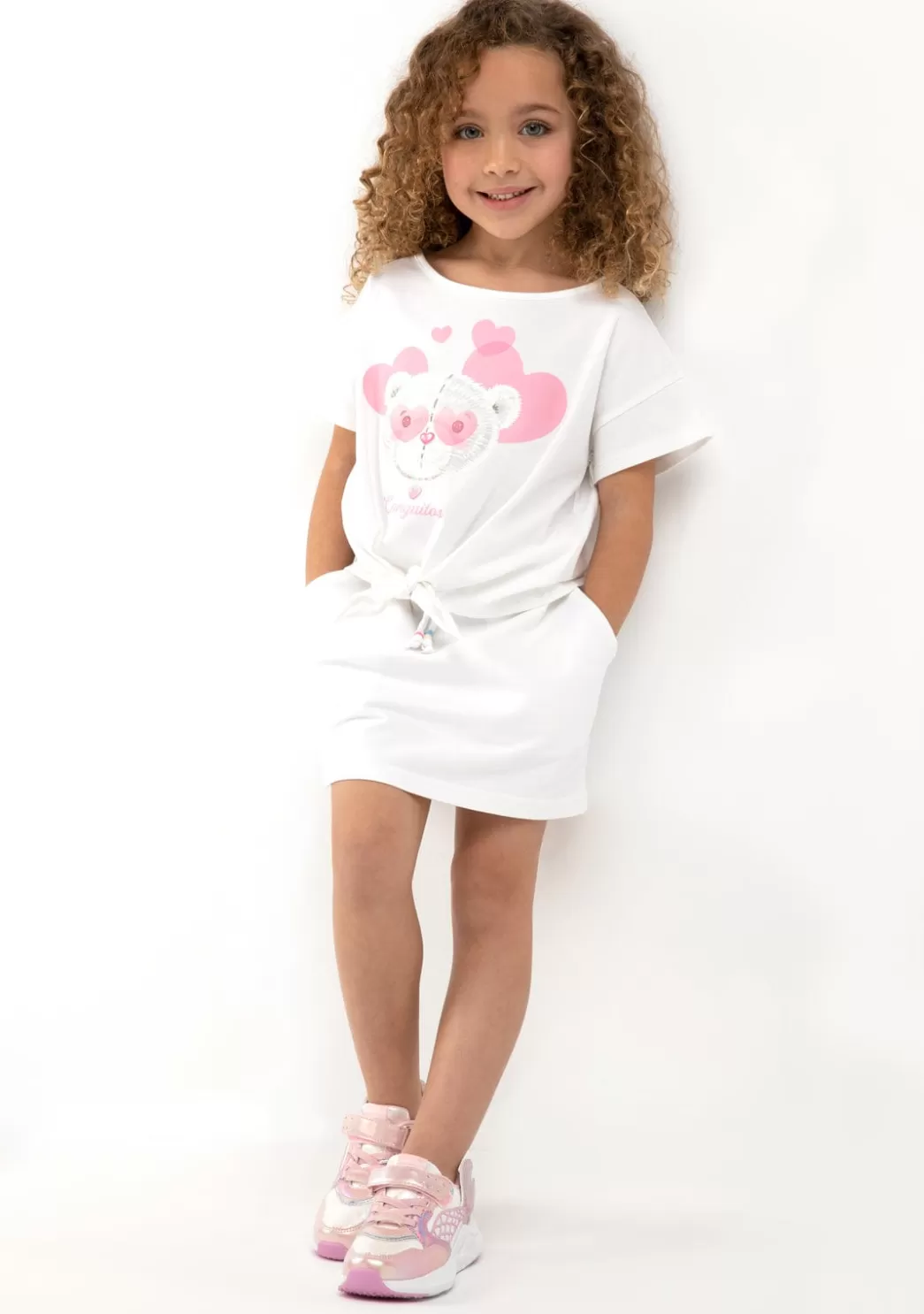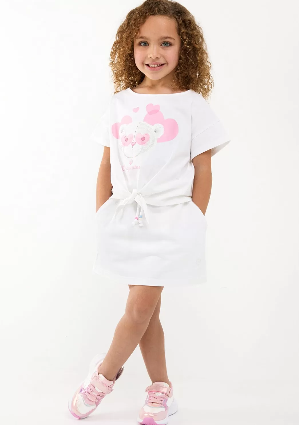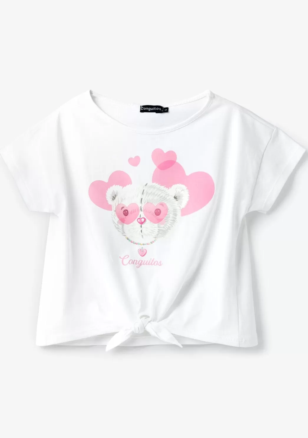 Esta encantadora camiseta para el día a día está estampada con un adorable oso y corazones. Tiene cuello redondo y un nudo en la parte inferior para hacerla aún más divertida