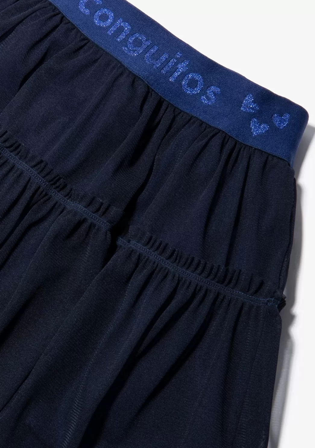 Falda de niña confeccionada en tejido de tul. Forro interior de algodón en color azul marino. Cinturilla elástica con el logo de la marca y corazones en lurex. Una prenda súper versátil que puedes utilizar tanto para ocasiones especiales de una forma más formal como para el día a día con un rollo más desenfadado.
