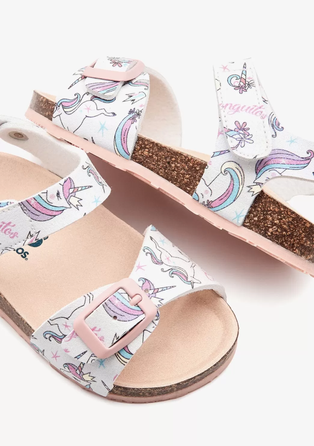 Este modelo de sandalias tiene una hebilla en la tira delantera y cuenta con cierre de tira adherente para mayor comodidad. Las sandalias son blancas, tienen estampados de unicornios y detalles en rosa.