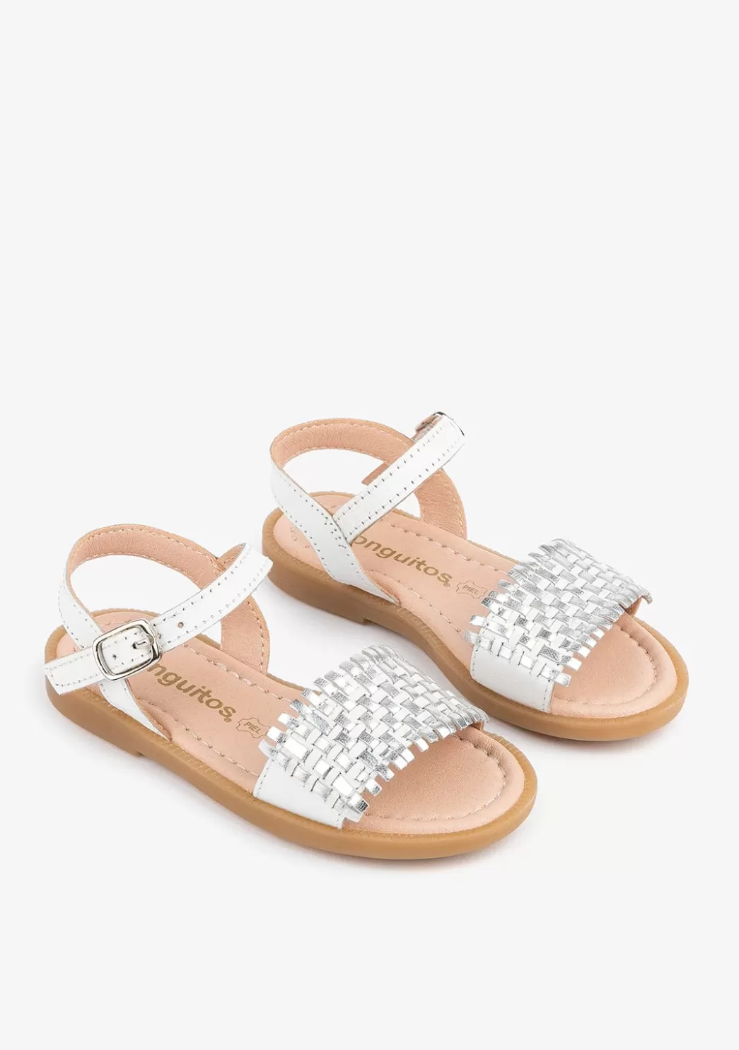 Sandalias de niña confeccionadas en piel de color blanco con adorno trenzado en la tira delantera en color plata. Tiene un cierre de hebilla mediante pulsera que se ajusta al tobillo y garantiza una total sujeción del pie. Además, su suela es de goma, lo que las convierte en unas sandalias de calidad, cómodas y flexibles.
