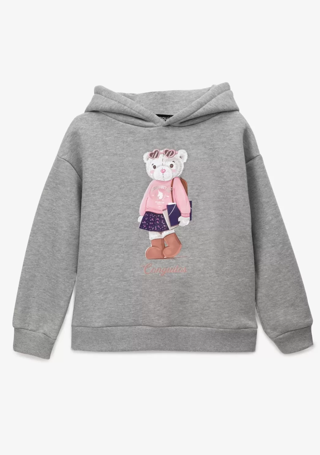 Sudadera con capucha para niña hecha de algodón con cálido interior de felpa. Mangas rectas con puños elásticos. Decoración frontal de un osito estudiante. Cómoda y elegante.