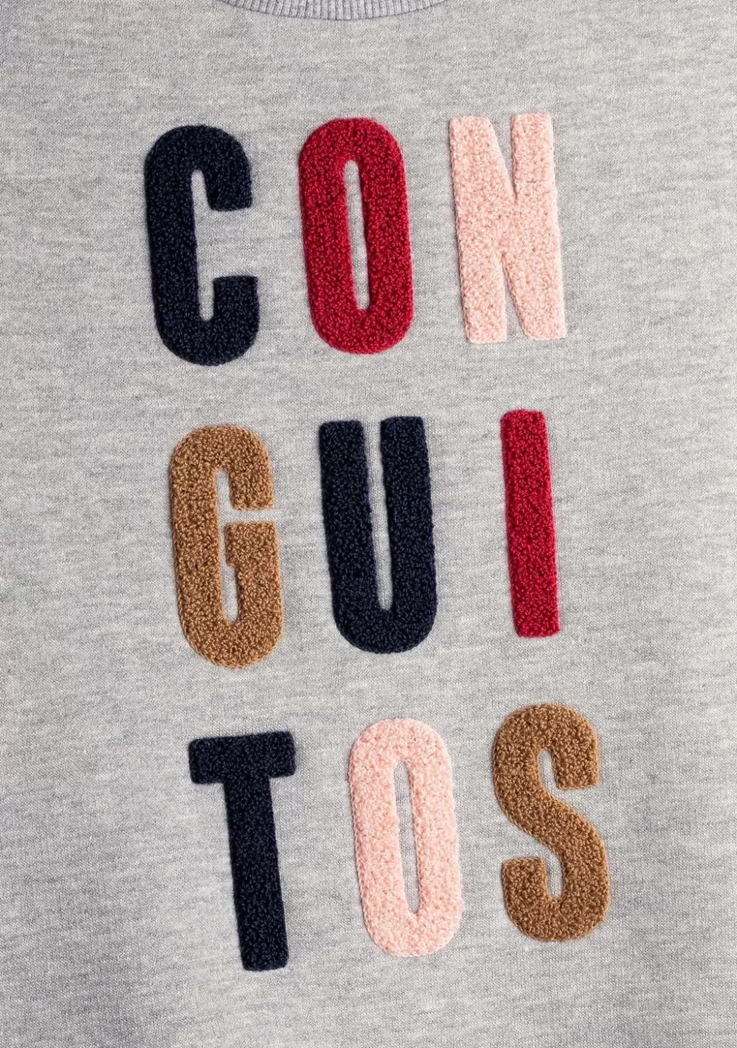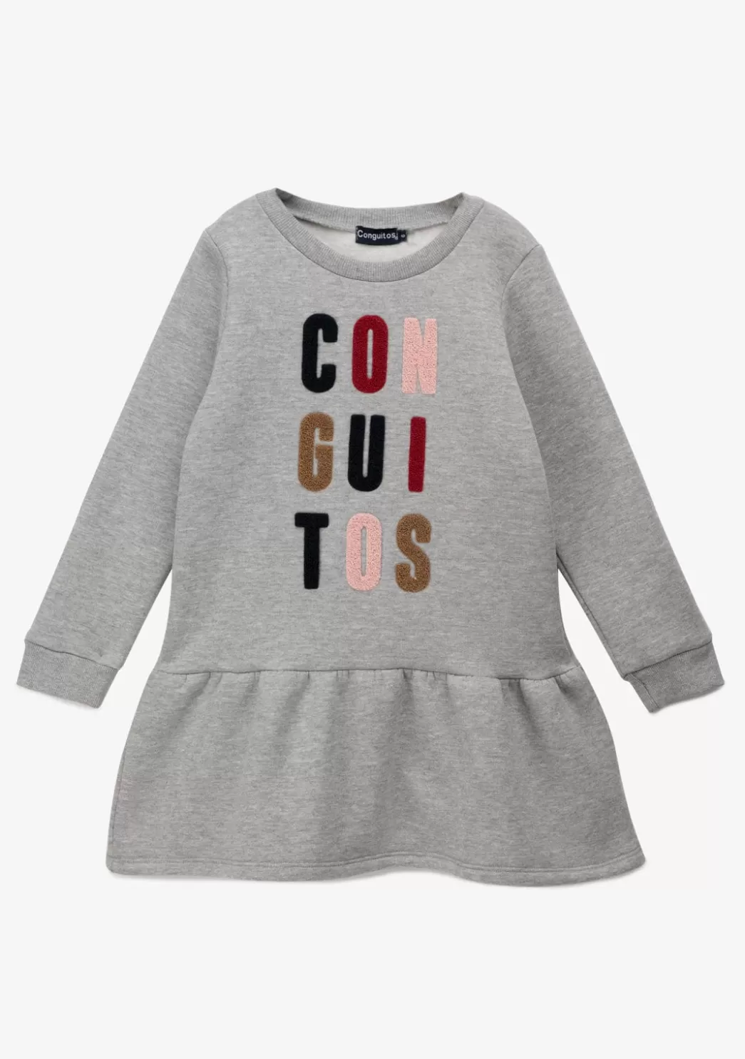 Vestido de niña estilo sudadera con mangas de corte recto y cuello redondo. Puños elásticos. Maxi volante a modo de falda en bajo. Decorado frontal con letras en textura formando la palabra Conguitos.