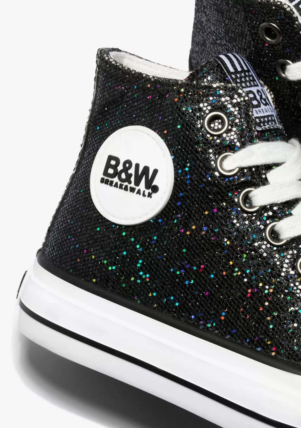 Zapatillas altas de niña confeccionadas en glitter. Cordones de algodón ajustables. Puntera reforzada. Suela de goma. Logo B&W en lateral externo. ¡Para no dejar de brillar!