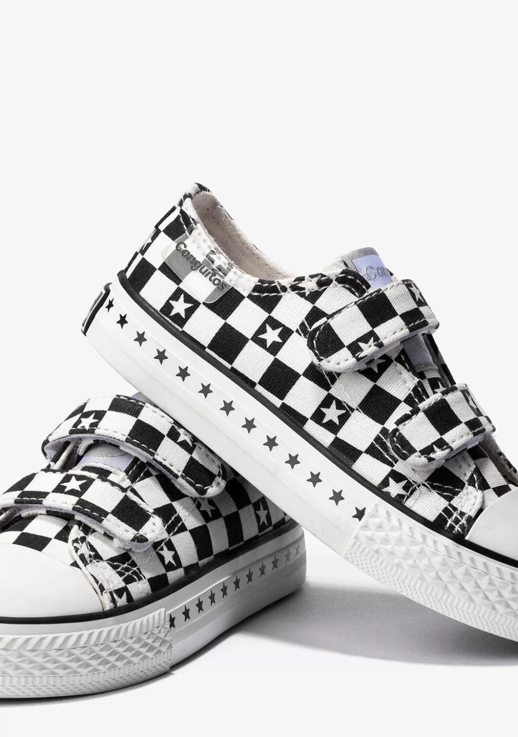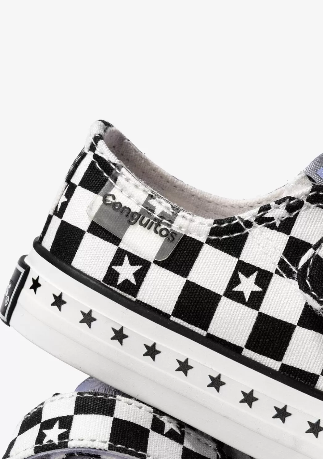 Zapatillas unisex confeccionadas en lona. Divertido estampado de cuadros y estrellas. Práctico cierre con doble tira adherente que garantiza la sujeción del pie. Puntera reforzada. Suela e goma que mejora el agarre con cenefa de estrellas rodeándola.