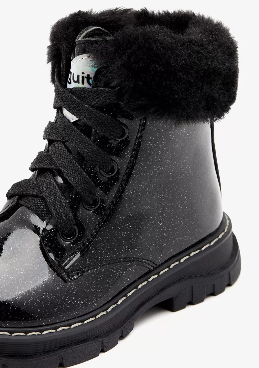 Este diseño en acabado negro está confeccionado con materiales sintéticos de alta calidad y estética brillante. Cuenta con un cierre de lazada con cordones efecto aterciopelado que permite un ajuste perfecto. Además, también presenta una cremallera en su parte interior y pelo exterior en su parte superior que le aporta un toque cálido.