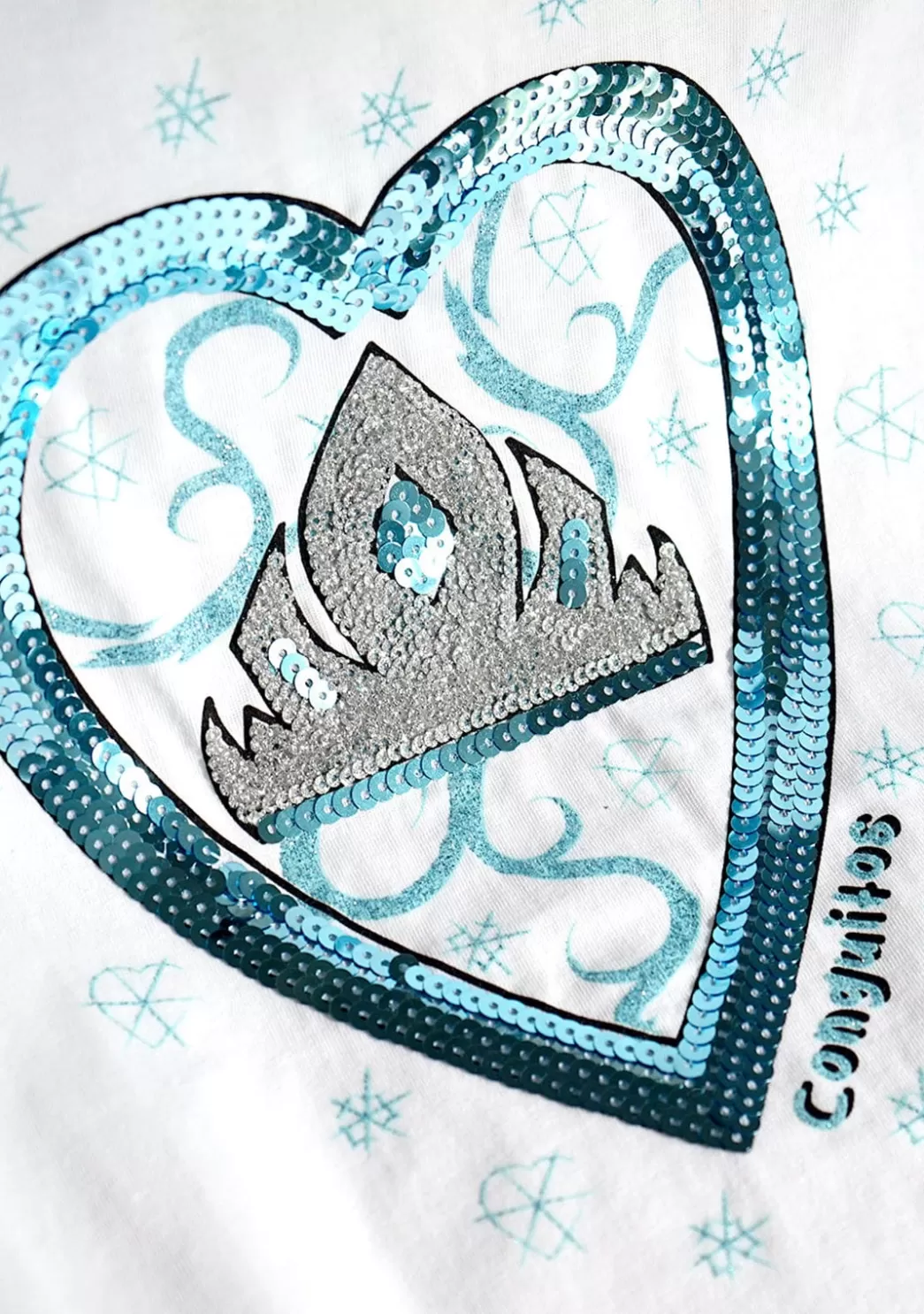 Camiseta de niña de manga corta con dibujo de corona y corazón con lentejuelas en tonos azules y plata. Este camiseta con detalles de princesa y copos de nieve, está fabricada en algodón aportando suavidad y comodidad. ¡Una camiseta ideal para combinar con nuestras Zapatillas con Luz Fantasía!