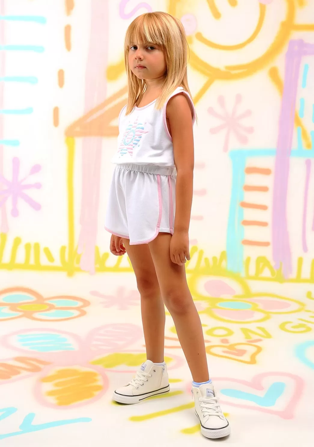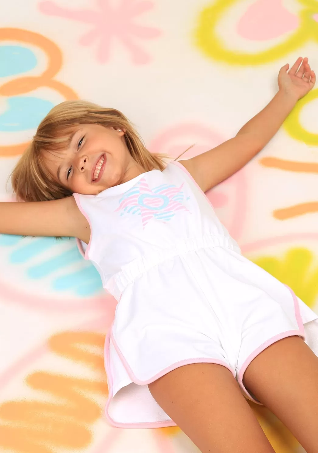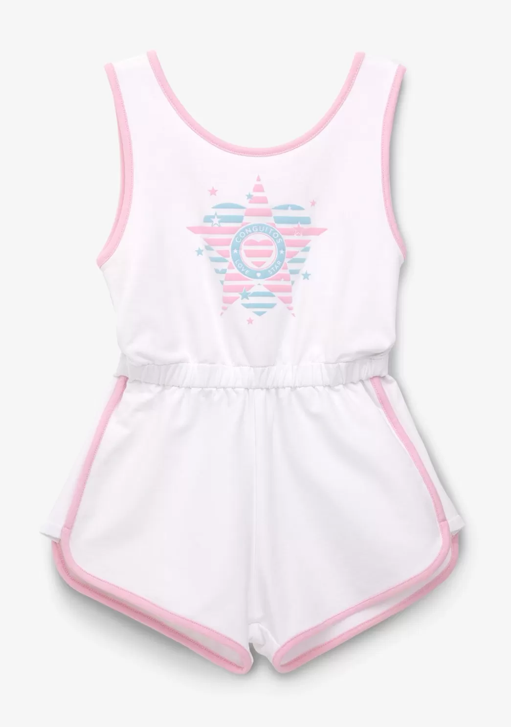 Mono de niña en color blanco con estampado rosa y azul en la zona delantera. Este mono está confeccionado en algodón y tiene el cuello redondo y sin mangas. Detalla una cintura elástica para mayor comodidad.