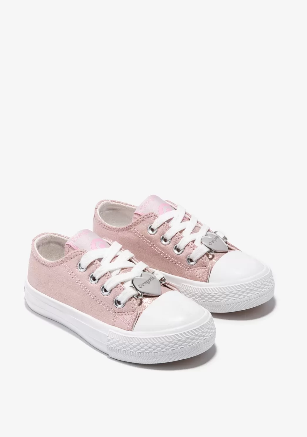 Este modelo con acabado rosa presenta el emblema de Conguitos en el talón. Tiene cordones blancos adornados con un aplique en forma de corazón. Cuenta puntera reforzada que aporta resistencia.