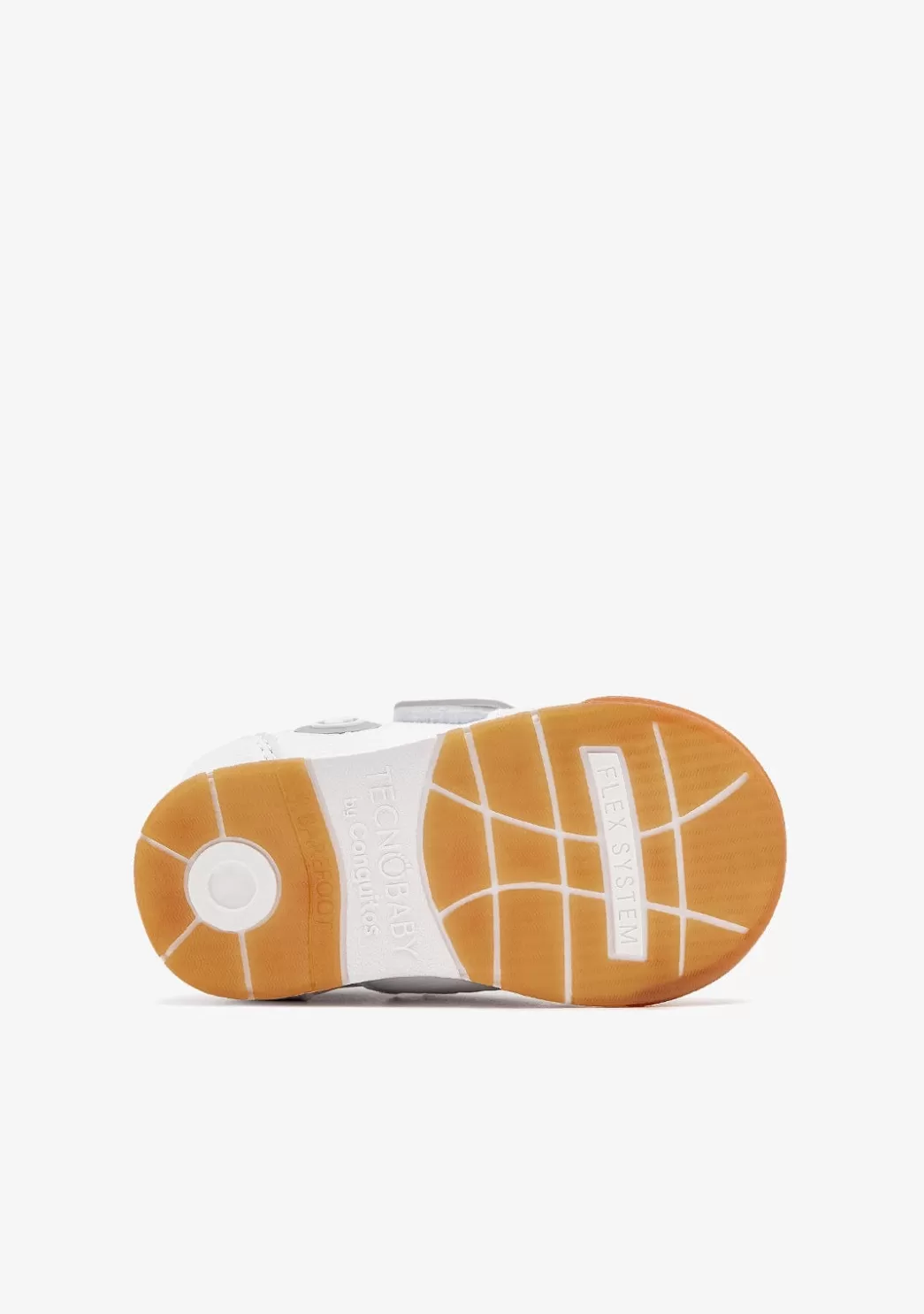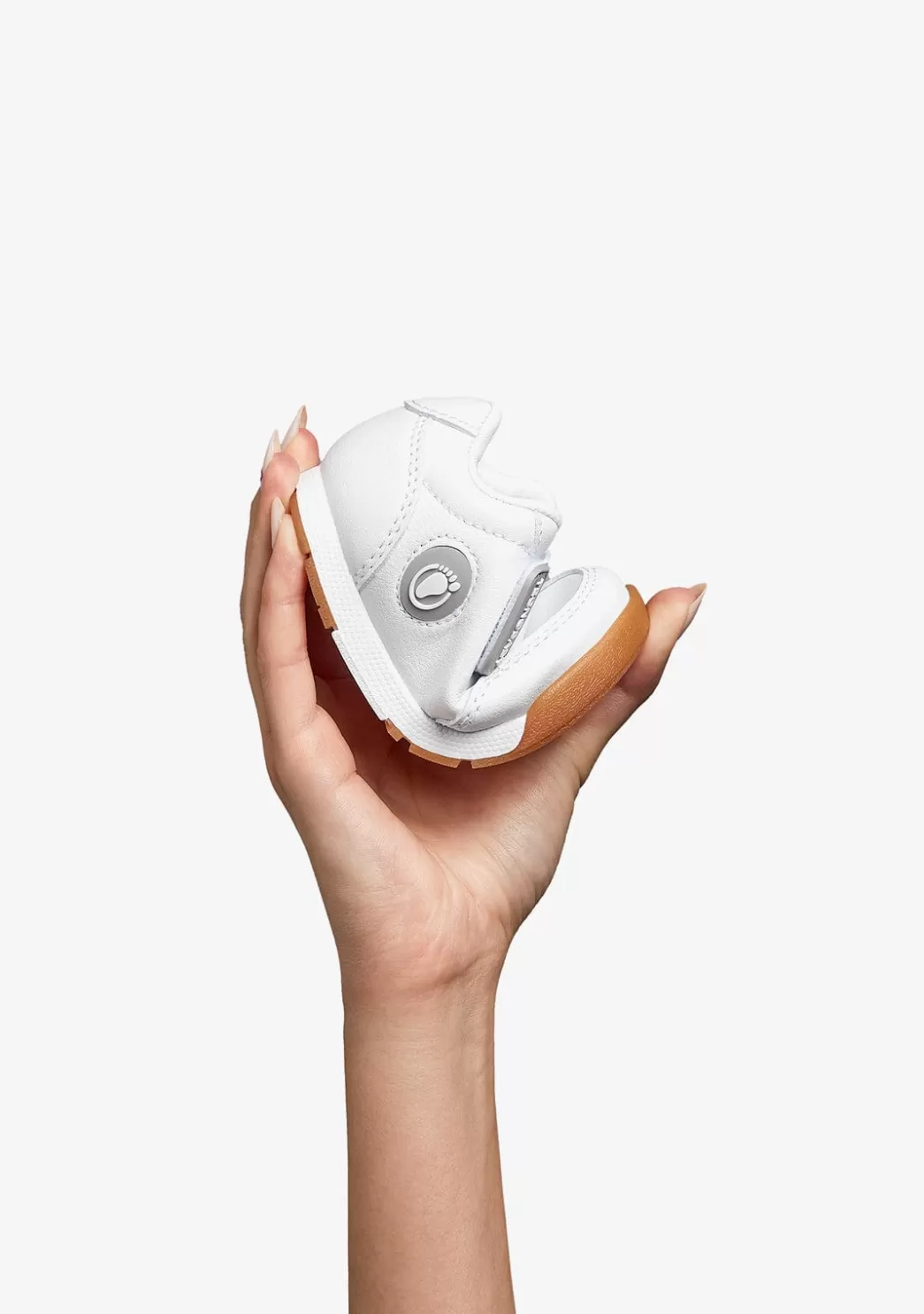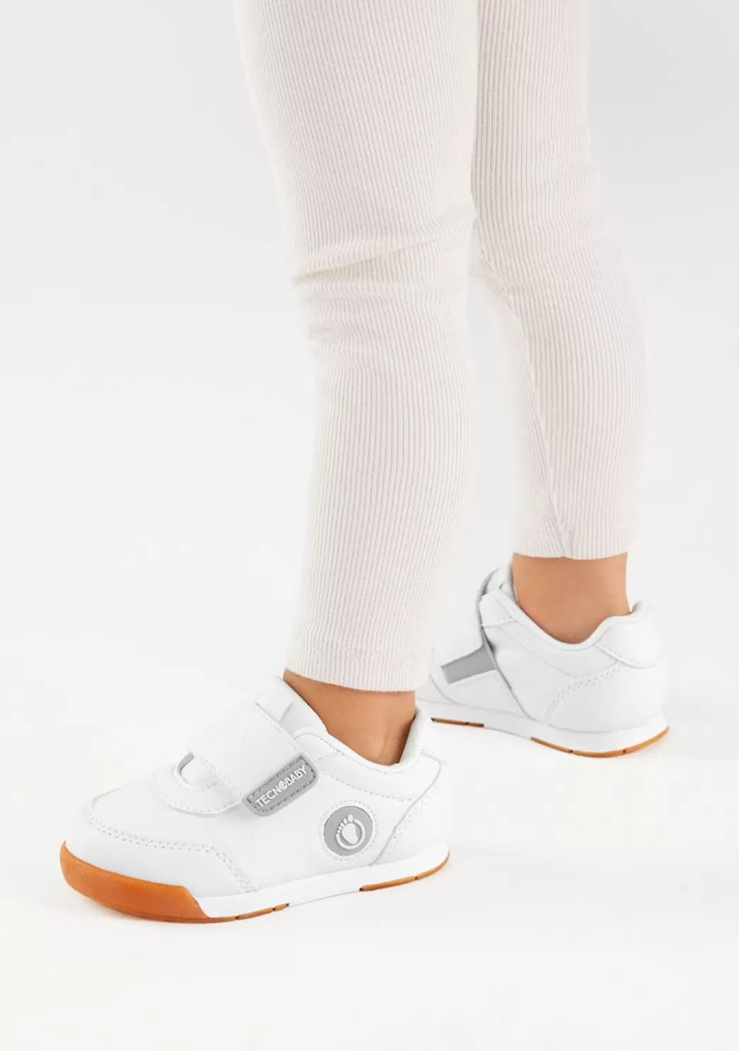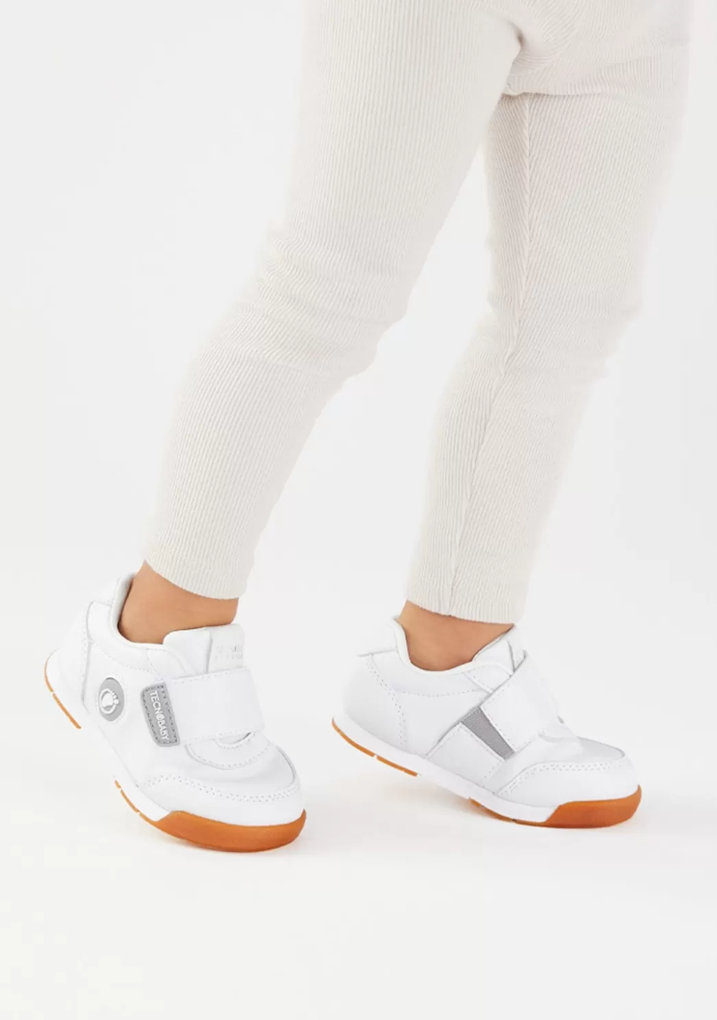 Calzado respetuoso tipo sneaker en acabado totalmente blanco para sus primeros pasos. Este diseño cumple con todos los requisitos podológicos: es ligero, flexible, con puntera ancha y con una suela cero drop que mantiene la misma altura desde el talón hasta la puntera. Estas características facilitan el andar con libertad, generando así el efecto descalzo o «barefoot».