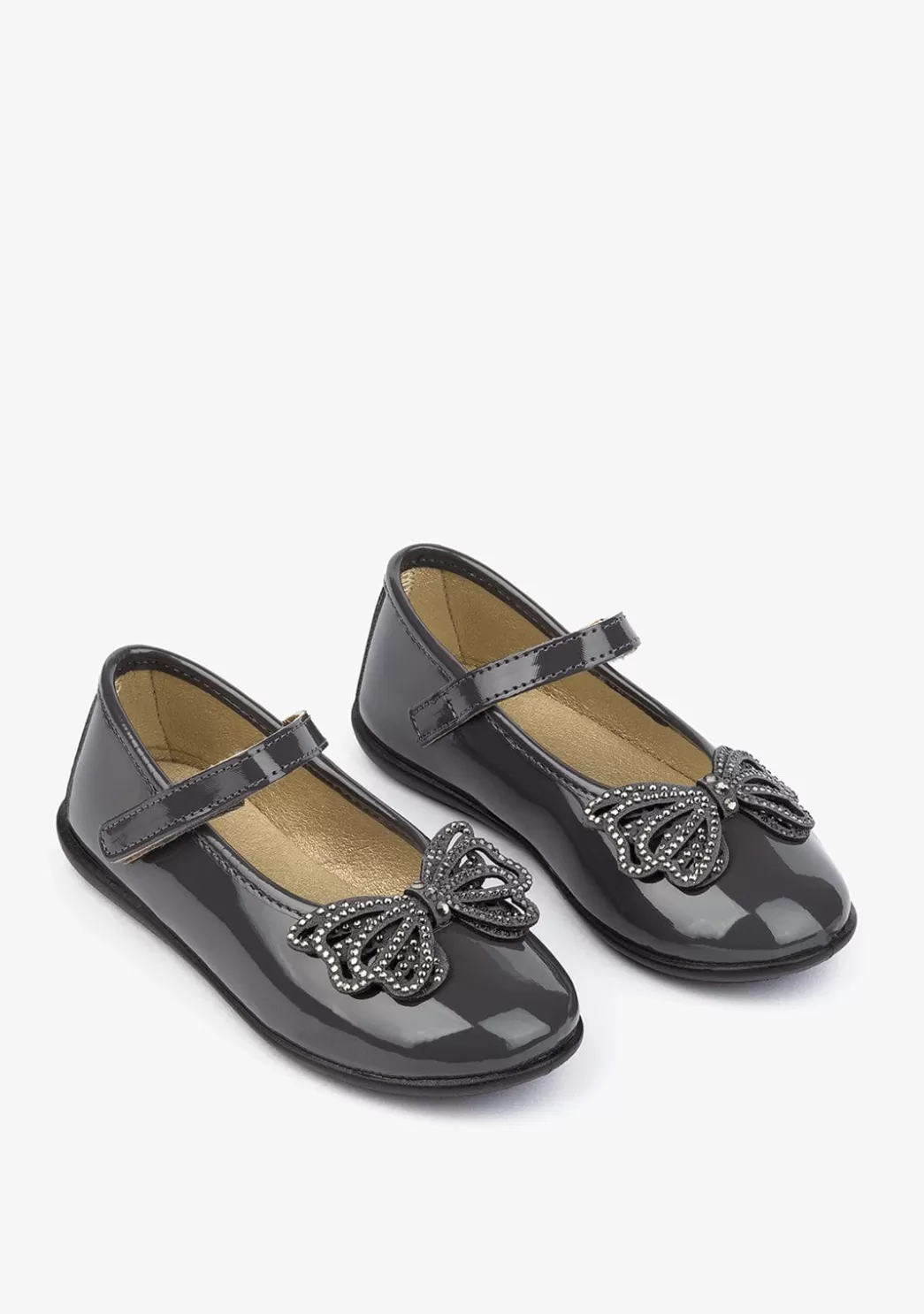 Bailarinas de niña en color gris con materiales sintéticos y acabado de charol. Dispone de una cinta en el empeine que garantiza la sujeción del píe y un lazo de pedrería como detalle. Con suela de goma para garantizar la flexibilidad y la comodidad de cada pisada.