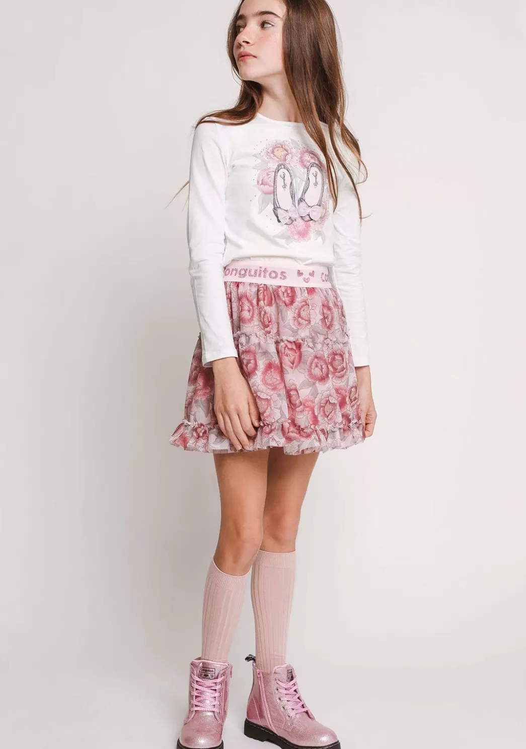 Camiseta de niña fabricada en algodón de color blanco con estampado de flores en la parte delantera de la camiseta con bailarinas serigrafiadas sobre ellas. Con aplicaciones de lazos sobre las bailarinas.