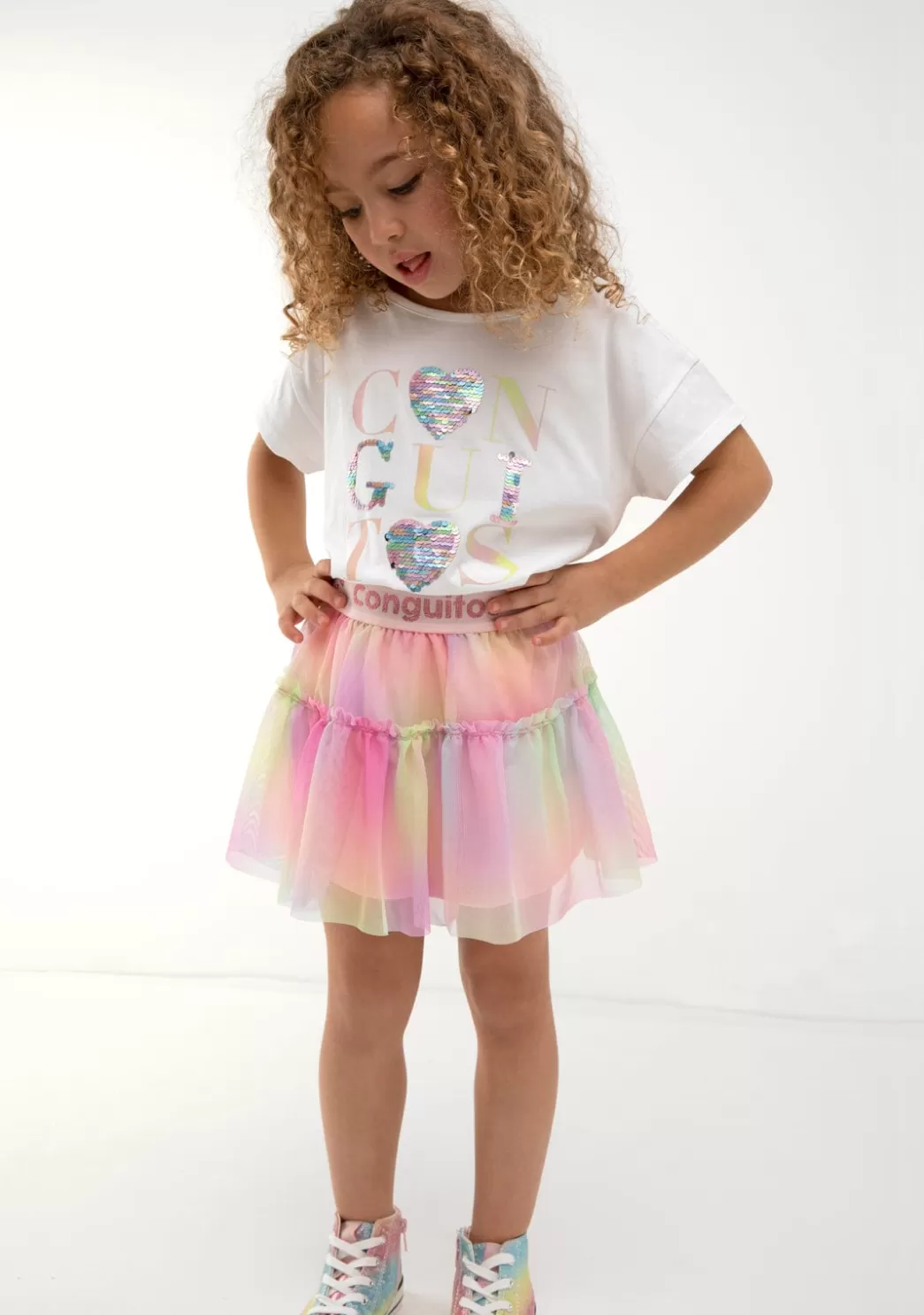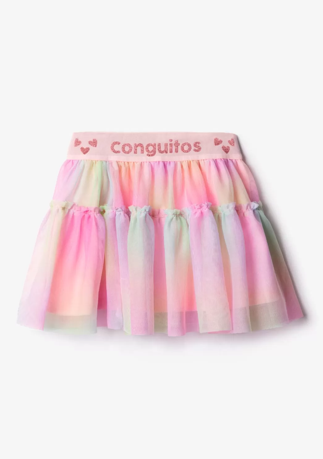 La falda confeccionada en tejido de tul cuenta con un forro interior. La cintura es elástica y estampada con corazones y el emblema de Conguitos en lurex.