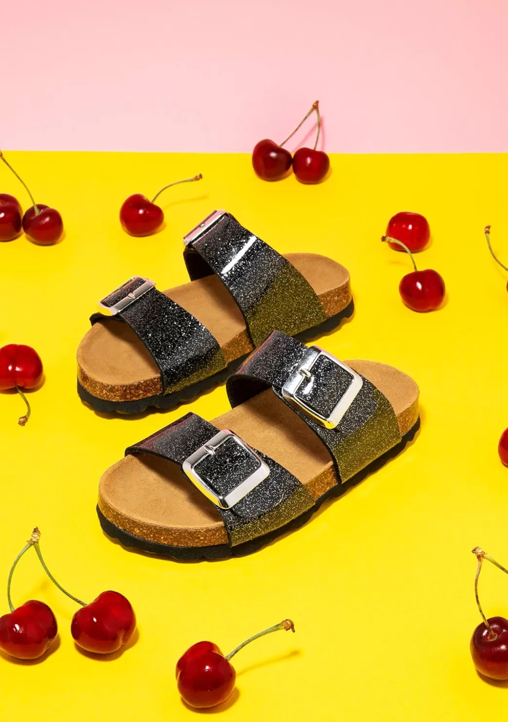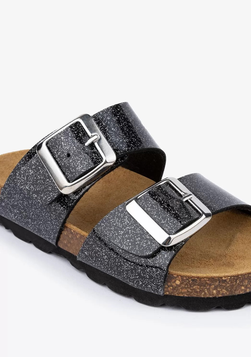 Sandalias de niña con suela bio y doble tira, ambas en charol negro con purpurina. Cuentan con cierre de doble hebilla que permite un ajuste perfecto al pie. Confeccionada con materiales sintéticos, resistentes y ligeros. Y suela de goma que garantiza una mayor protección y durabilidad.