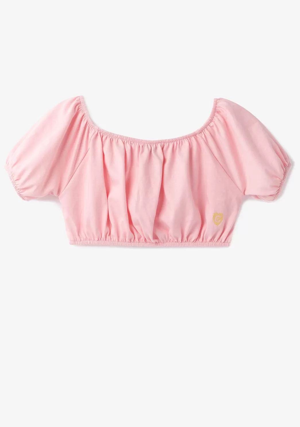 El top rosa es de manga corta al hombro y corto. Tiene acabado en goma elástica en el cuello y en el bajo para mayor comodidad. Un básico decorado con el emblema de Conguitos ideal para ocasiones casuales.