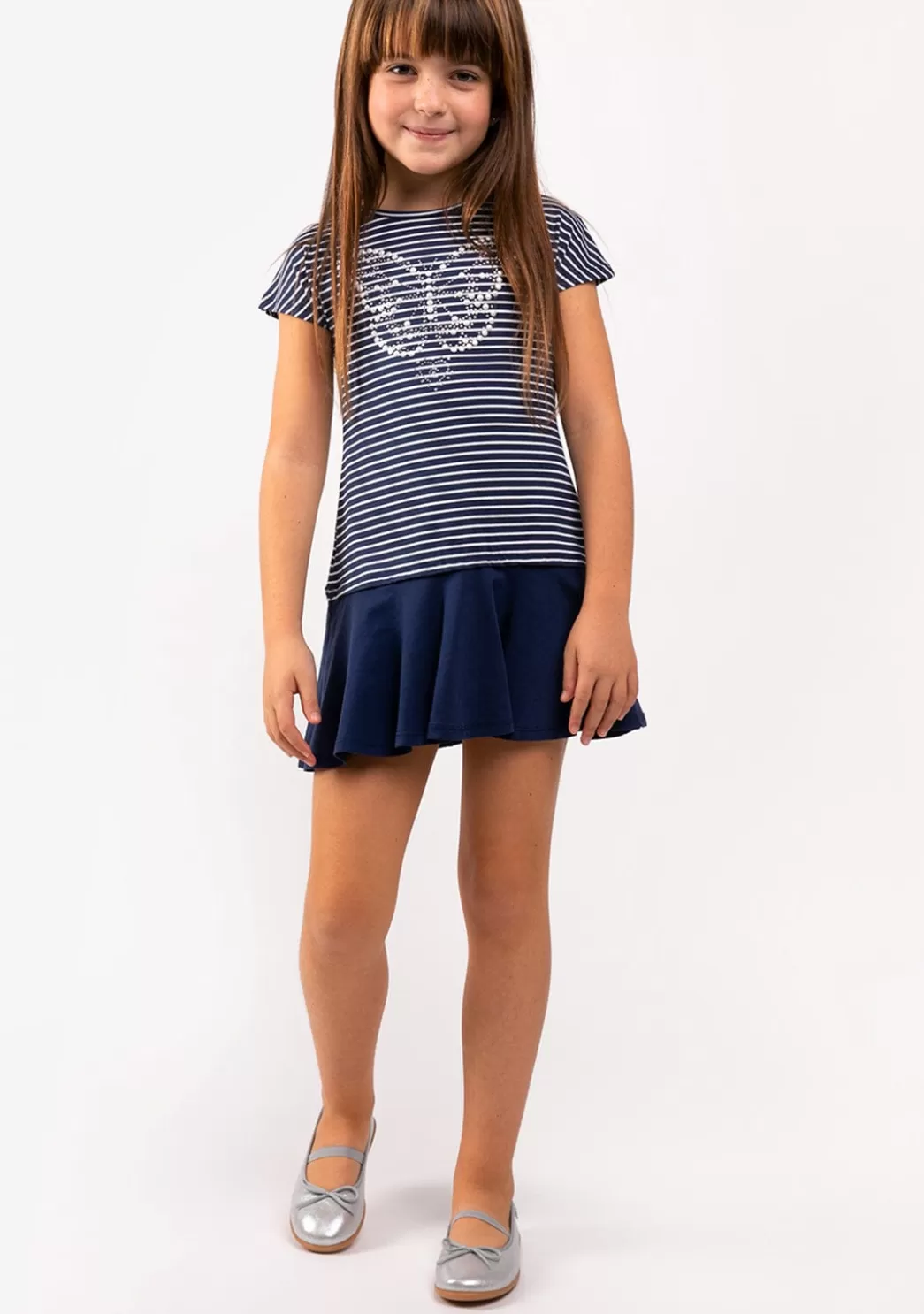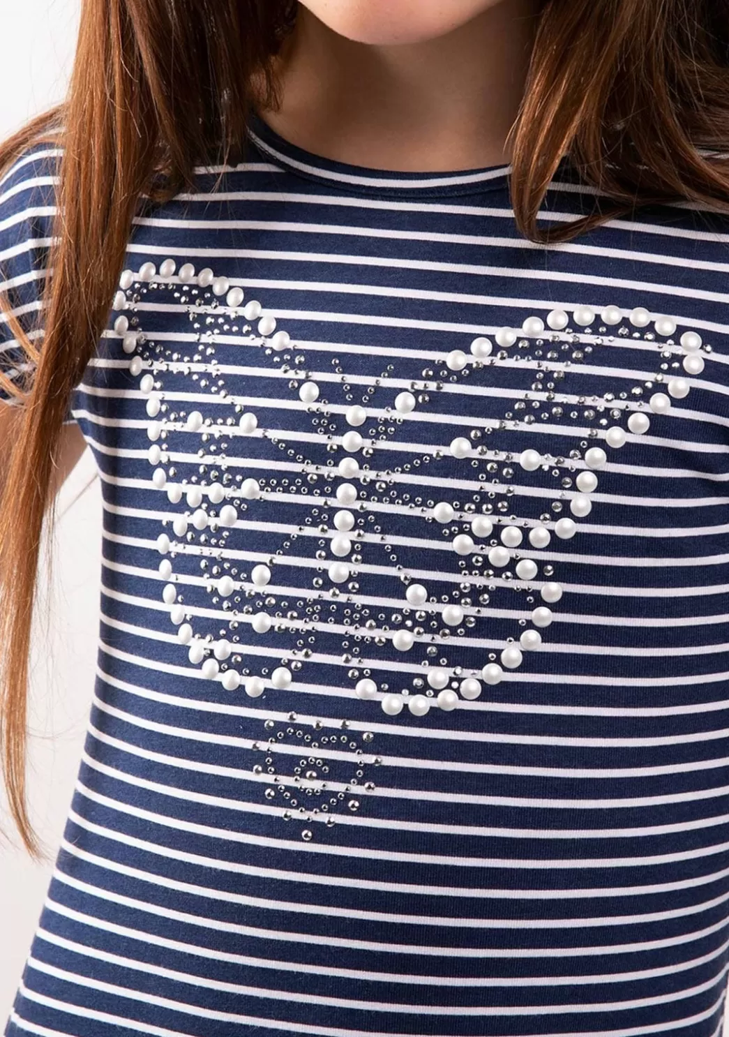 Vestido de niña que combina el color azul marino con rayas blancas. También tiene un estampado de mariposas con detalle de perlas. Este vestido de manga corta está hecho de algodón 100% y tiene volantes en la parte inferior.