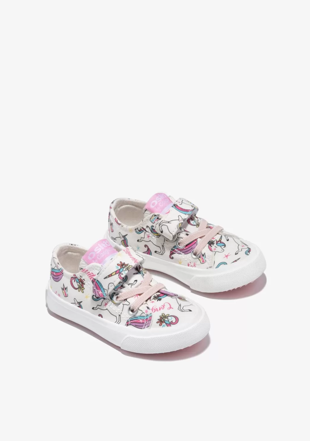 Las zapatillas altas de lona tienen estampados de unicornios de colores. Cuentan con una tira adherente de fácil quita y pon y cordones elásticos decorativos en color rosa. También, tienen el logo en la parte superior y en el talón.