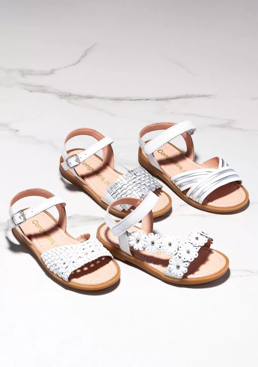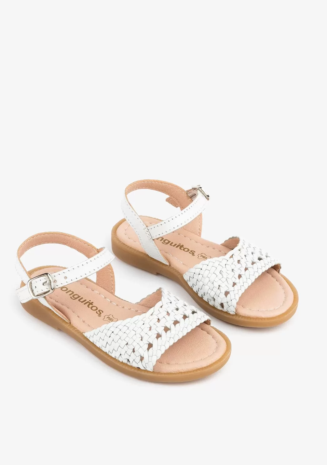 Sandalias de niña confeccionadas en piel de color blanco con adorno trenzado en la tira delantera. Tiene un cierre de hebilla mediante pulsera que se ajusta al tobillo y garantiza una total sujeción del pie. Además, su suela es de goma, lo que las convierte en unas sandalias de calidad, cómodas y flexibles.