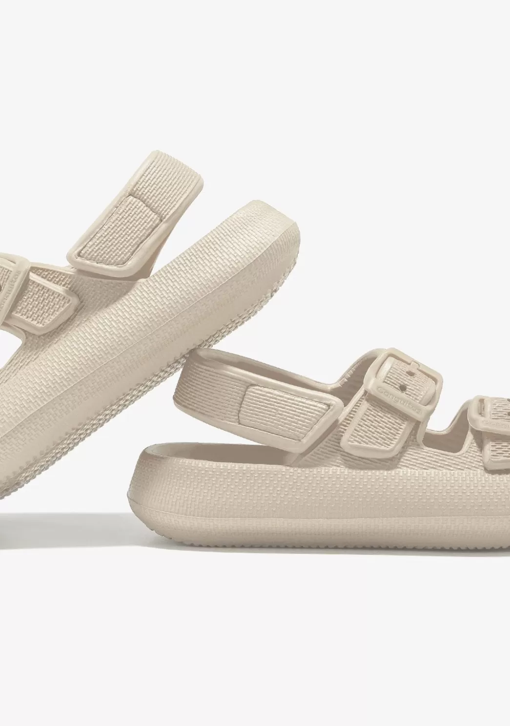 Este modelo beige tiene 3 correas: dos con dos cierres de hebilla y otra con cierre de tira adherente de quita y pon. Están fabricadas en EVA, que ofrece comodidad extra al amoldarse al pie.
