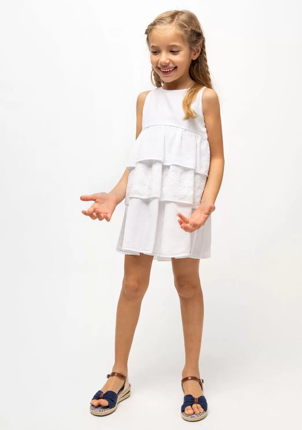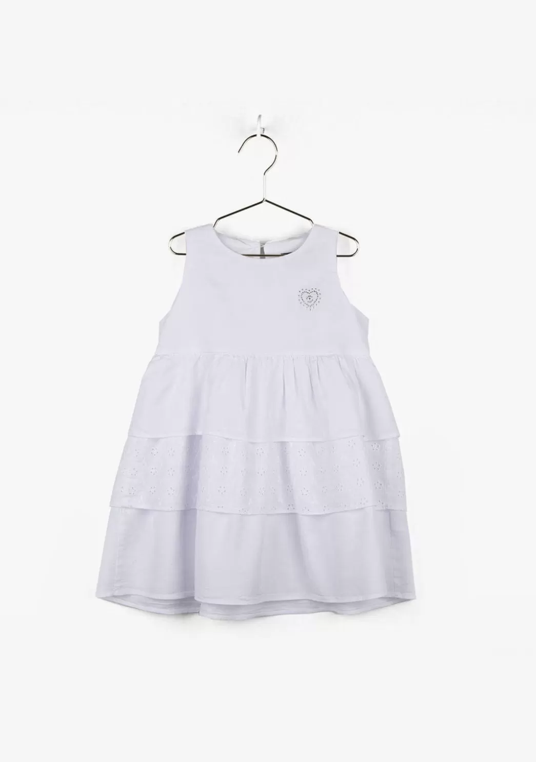 Vestido de tirantes de niña fabricado en tencel de color blanco con falda de volantes. Este vestido tiene 3 volantes, donde el del centro tiene detalles de troquel en forma de flores, en el pecho tiene como detalle de strass el logo de Conguitos en forma de corazón. Este vesido junto a unas bailarinas es perfecto para eventos como comuniones o bautizos.