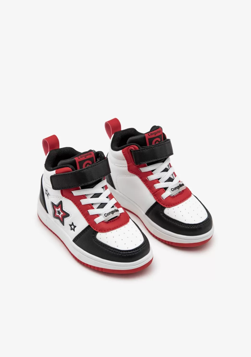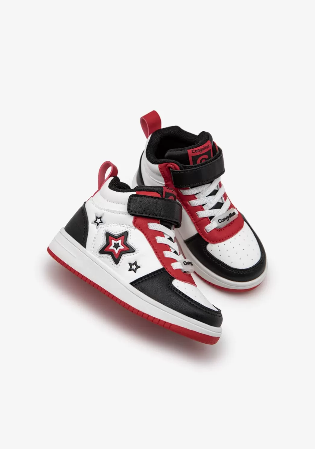 Zapatillas altas en colores negro, rojo y blanco con detalles de estrellas. La gran estrella ubicada en el lateral del zapato se ilumina al ritmo de sus pasos.