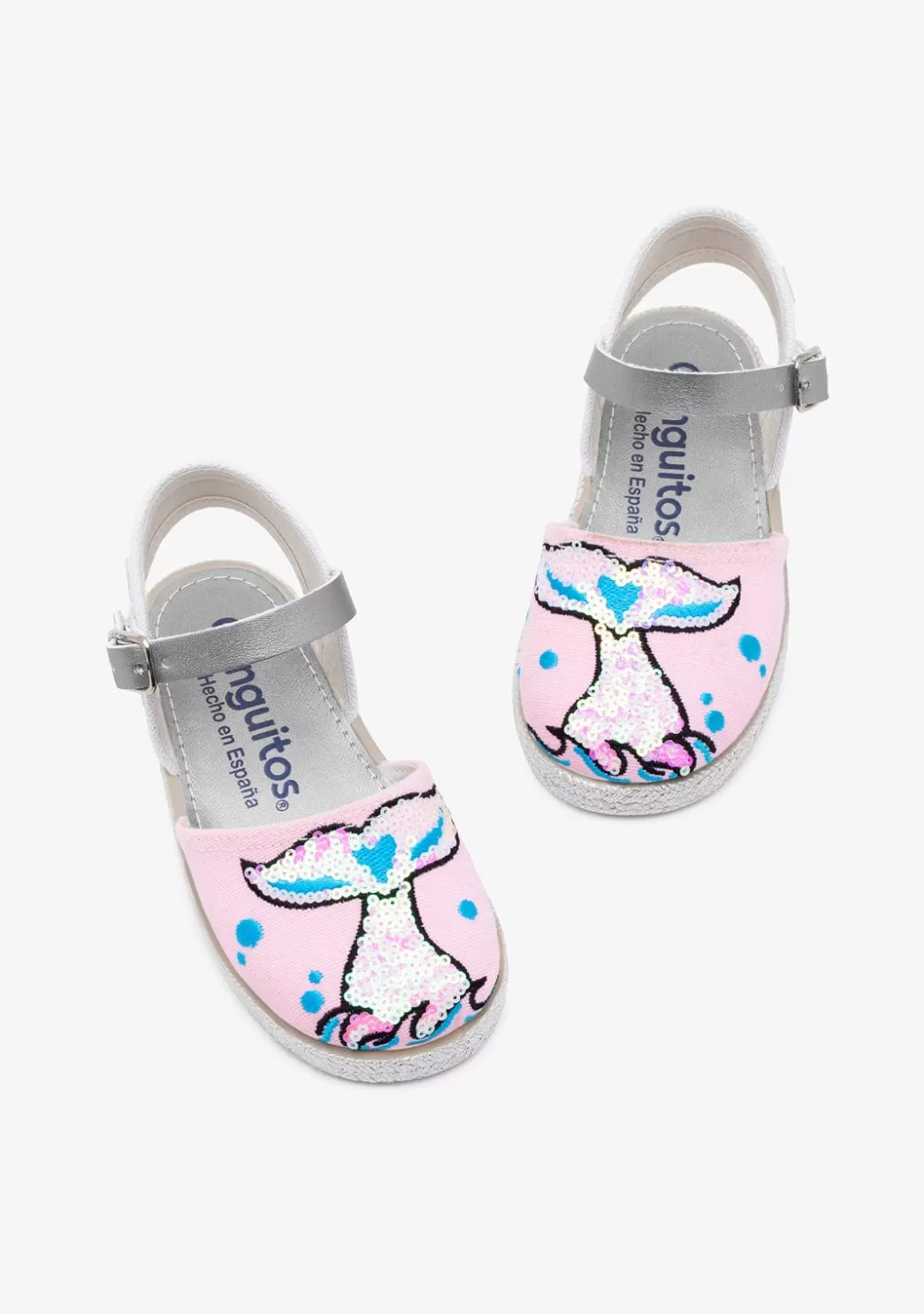 Alpargatas valencianas infantiles de color rosa claro con bordado de sirenita y burbujas con la cola rellena de de lentejuelas de color rosa iridiscente y las burbujas azules. Disponen de suela de yute y cierre de pulsera con hebilla en color plata, con la planta transpirable y el piso es de goma. ¡Las más bonitas y veraniegas!