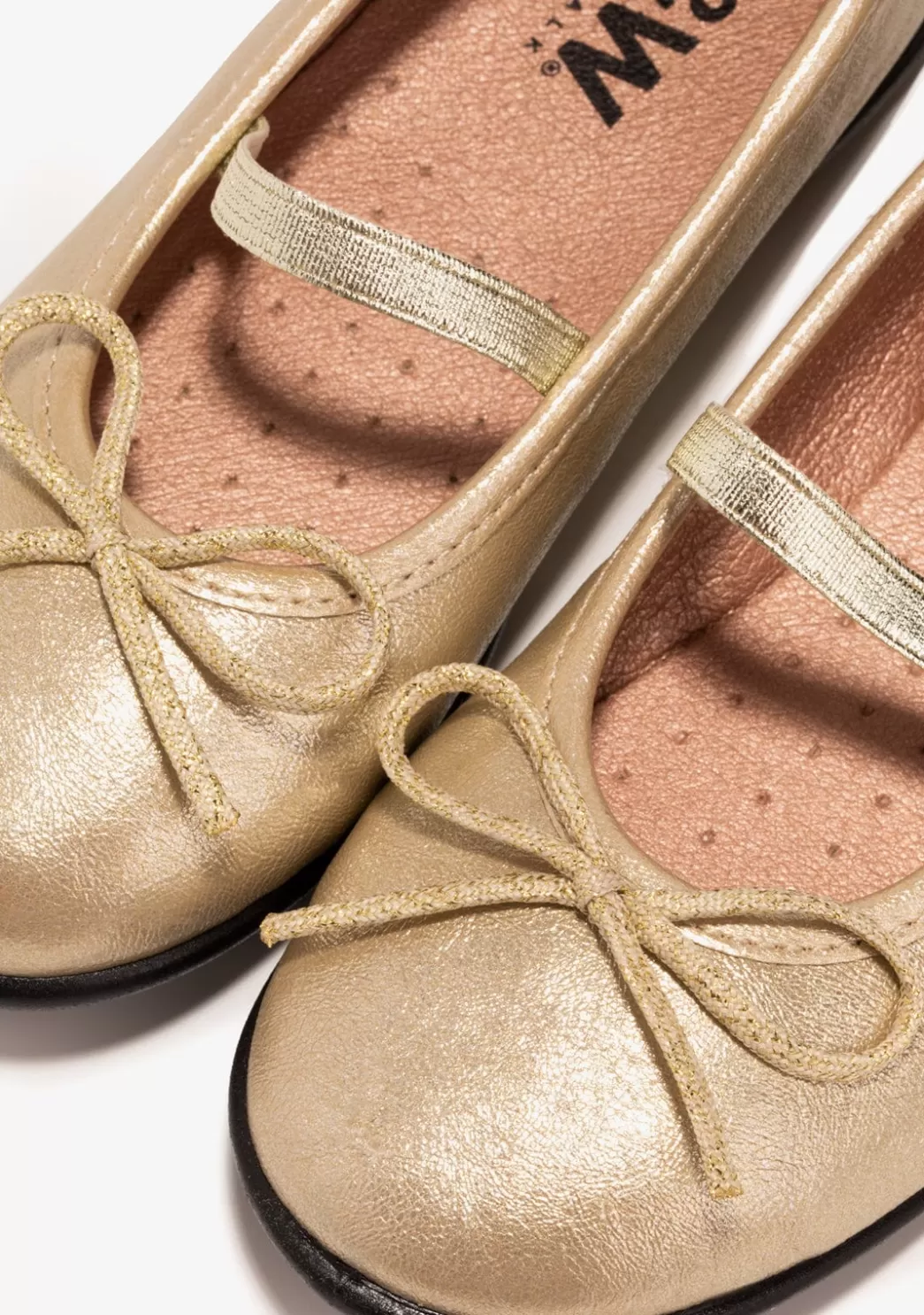 Bailarinas fabricadas en material metalizado de color oro, con tira elástica en el empeine para una correcta sujeción. Disponen de plantilla transpirable en material textil. Estas manoletinas tienen la suela de goma inyectada para máxima comodidad de la niña y detalle de lazo en la puntera.