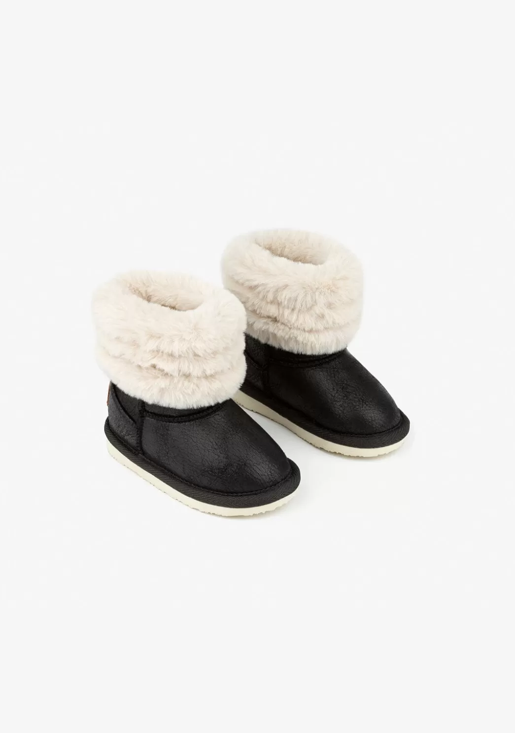 Botas australianas para bebés en color negro fabricadas en microfibra, con pelo sintético exterior e interior en la caña de la bota. Con detalle en el talón de la etiqueta Osito by Conguitos y suela de goma. Botas estilo aviador con pelo más suave y agradable al tacto, totalmente unisex, perfectas para los días más fríos de este invierno.