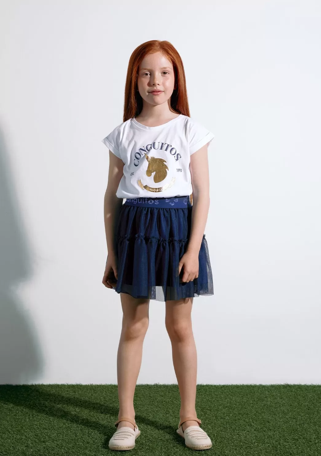 La falda confeccionada en tejido de tul cuenta con un forro interior. La cintura es elástica y estampada con corazones y el emblema de Conguitos en lurex.
