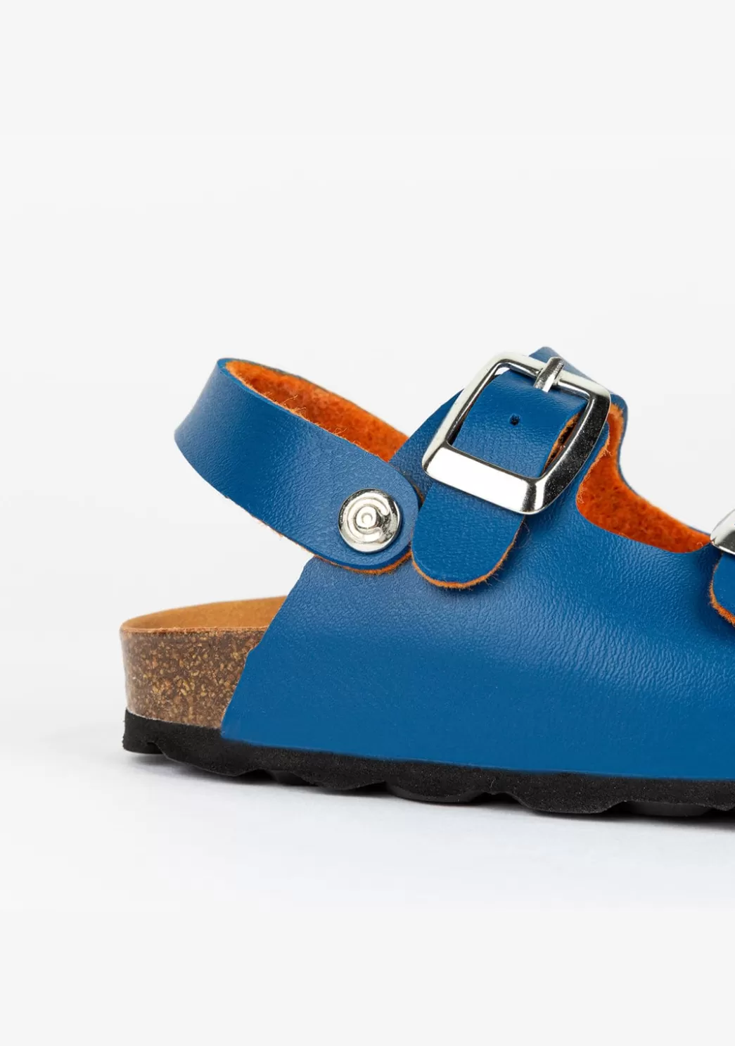Sandalias de bebé tipo bio con acabado polipiel en color azul con dos correas cerradas mediante hebilla para un ajuste perfecto. Ambas correas se encuentran en la zona del empeine, mientras que va sujeto mediante una tira por el talón. Fabricadas con un material sintético, resistente y ligero, con suela de goma que asegura una mayor protección y durabilidad.