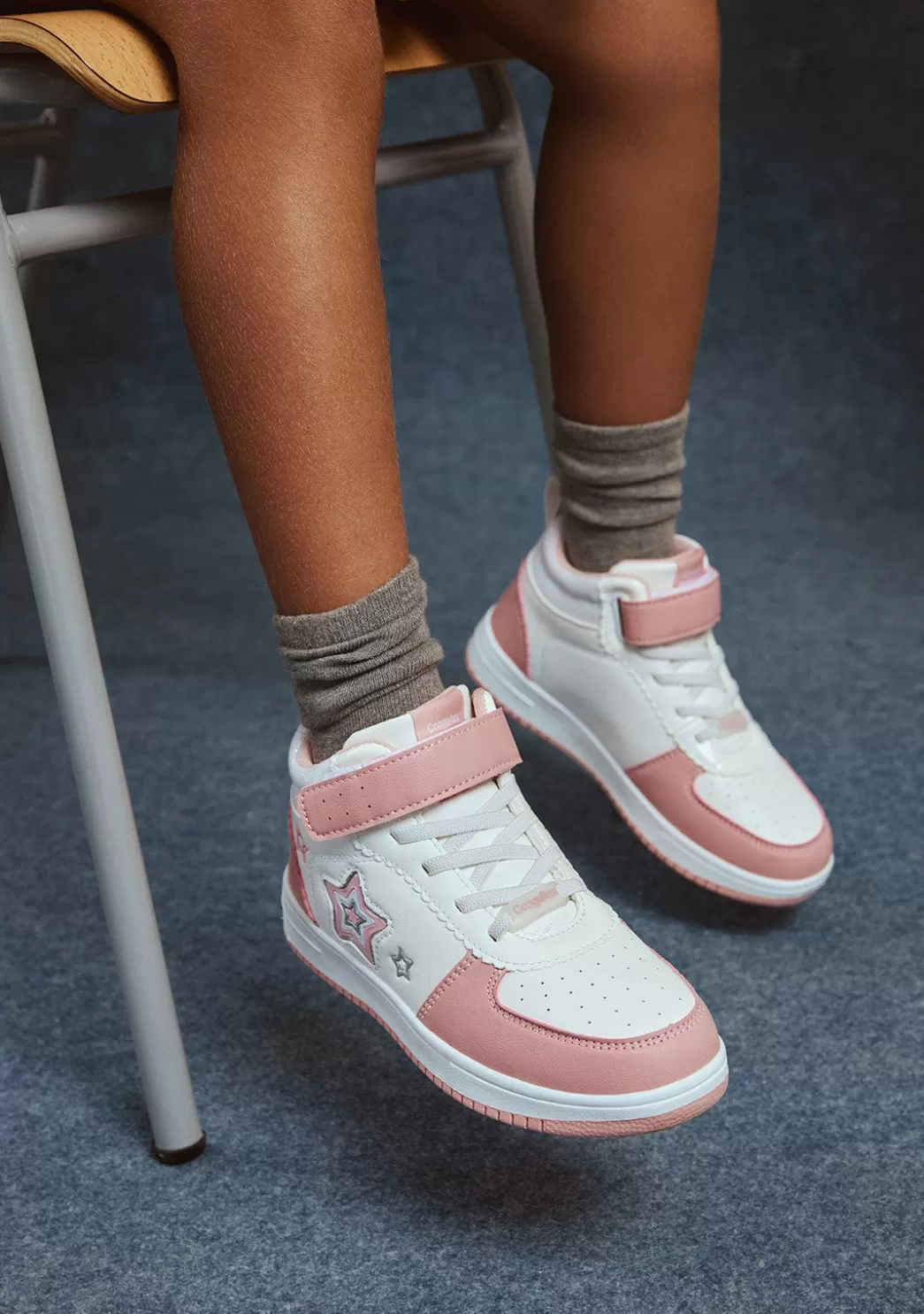 Zapatillas altas en colores rosa y blanco con detalles de estrellas. La gran estrella ubicada en el lateral del zapato se ilumina al ritmo de sus pasos.
