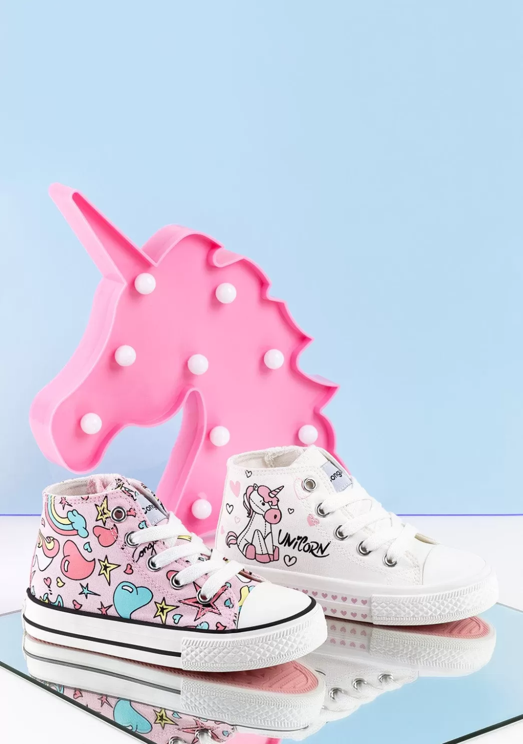 Las nuevas zapatillas altas de lona en color rosa con cordones. Tienen detalles de cordón y cremallera en el lateral de la bota. Suela de goma que garantiza la flexibilidad y puntera reforzada para una mayor protección de los dedos. En estas zapatillas se pueden ver unicornios, corazones, estrellas y arco iris, la combinación perfecta.