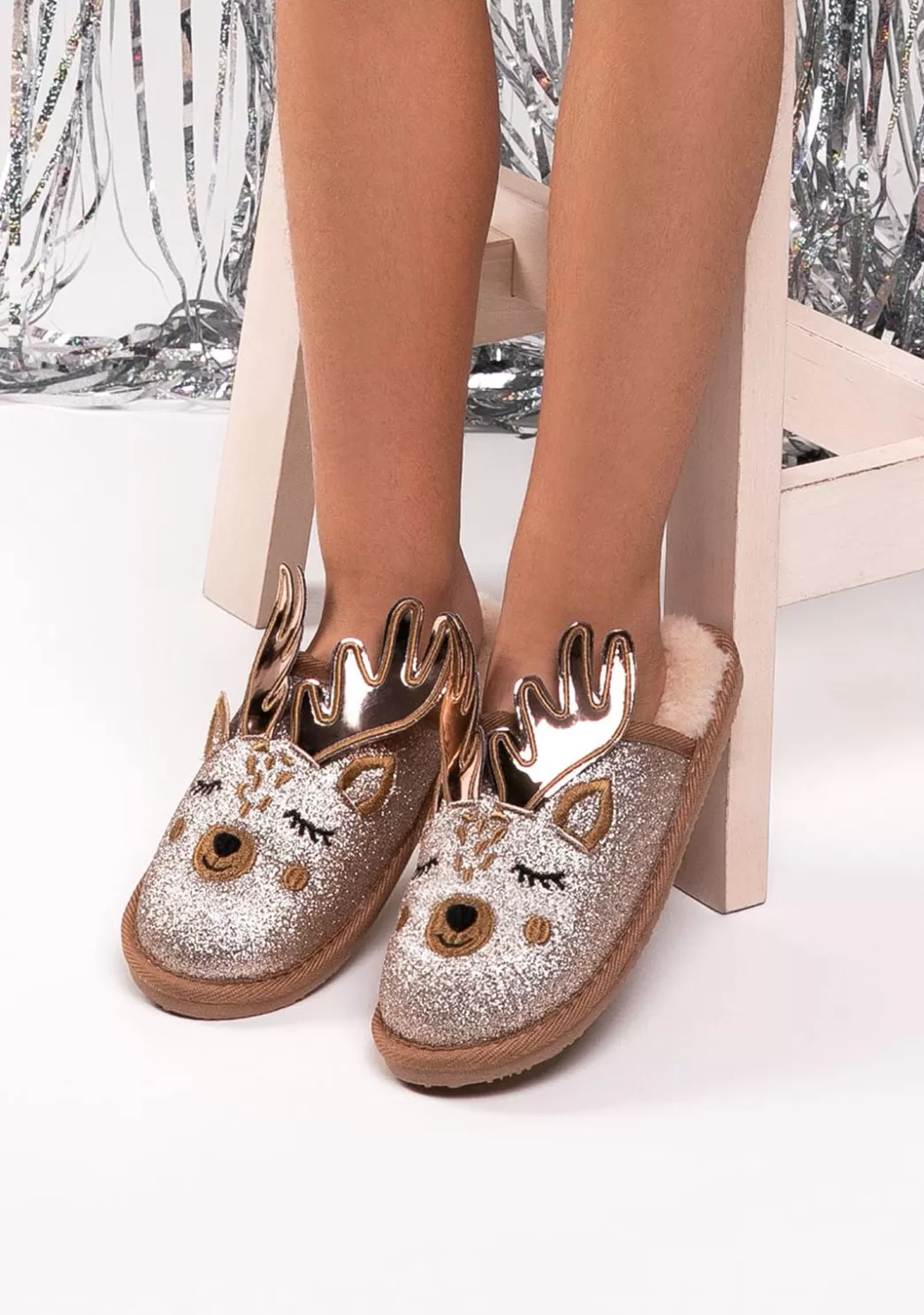 Zapatillas de estar por casa de reno! Las pantuflas más especiales para que los más peques puedan ir cómodos y calentitos por casa. Con detalles de reno como los cuernos y la carita fabricadas en microfibra con acabado glitter platino. Disponen de pelo interior y suela de goma para aislar del frío. ¡Para no dejar de brillar!