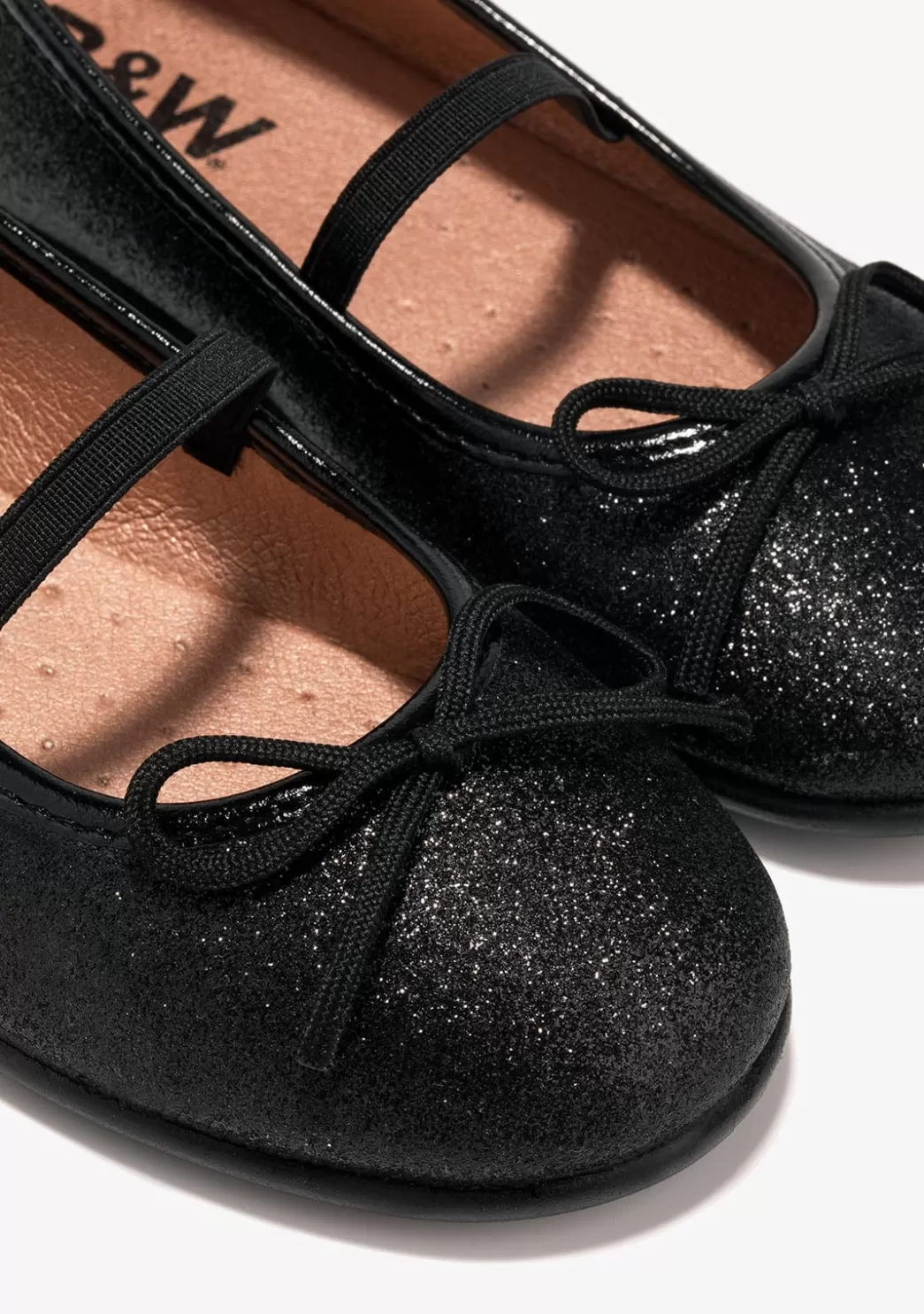 Bailarinas negras con glitter para brillar con comodidad. Decoradas con un lazo en la parte frontal son el toque especial que necesitas para los looks de los pequeños