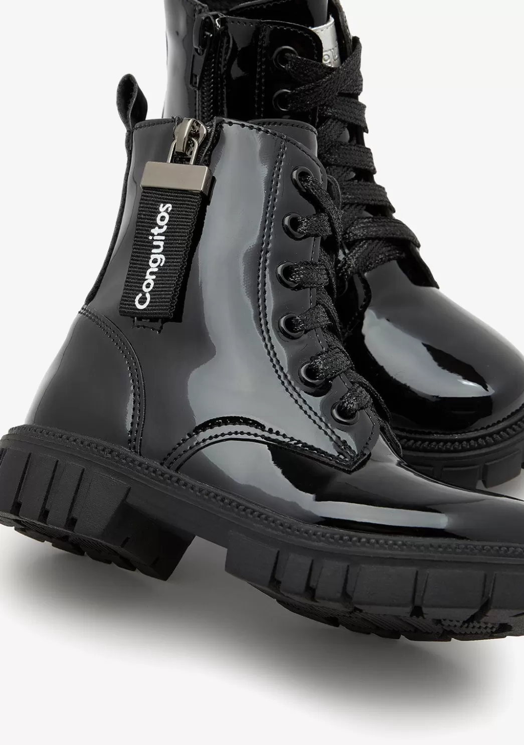 Este diseño en tono oscuro está confeccionado con materiales sintéticos de alta calidad. Cuenta con una cremallera lateral que lleva un detalle con el emblema de Conguitos a juego en negro con logo. Además, también presenta un cierre de lazada que permite un ajuste perfecto y cremallera interior.