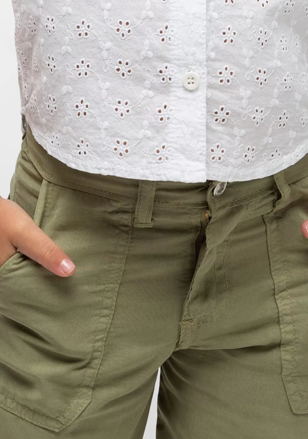 Pantalones de niña de corte culotte con camal recto y ancho, fabricado en tejido tencel y de color verde kaki. Estos pantalones tienen cierre mediante cremallera y botón, y disponen de 4 bolsillos, dos en la parte delantera y 2 en la trasera, donde uno de ellos lleva el logo en strass. Son los reyes de la colección en cuanto a moda y comodidad, ¡ideales para cualquier día!