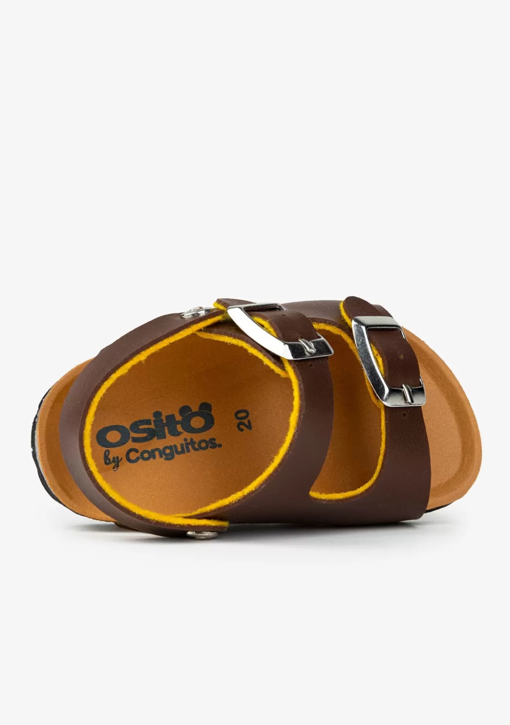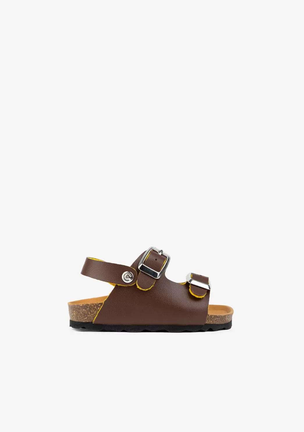 Sandalias de bebé tipo bio con acabado polipiel en color marrón con dos correas cerradas mediante hebilla para un ajuste perfecto. Ambas correas se encuentran en la zona del empeine, mientras que va sujeto mediante una tira por el talón. Fabricadas con un material sintético, resistente y ligero, con suela de goma que asegura una mayor protección y durabilidad.