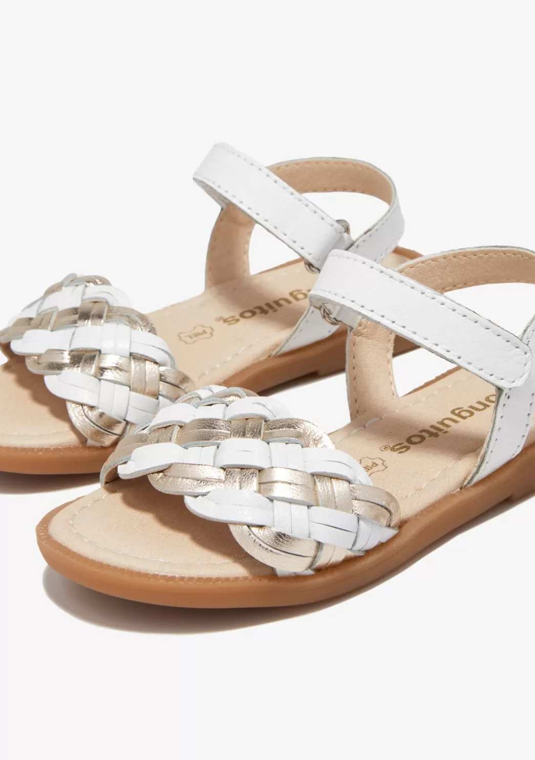 Estas sandalias están diseñadas en napa blanca y dorada. Su cierre es adherente lo que facilita su colocación y la parte frontal está formada por una tira trenzada.