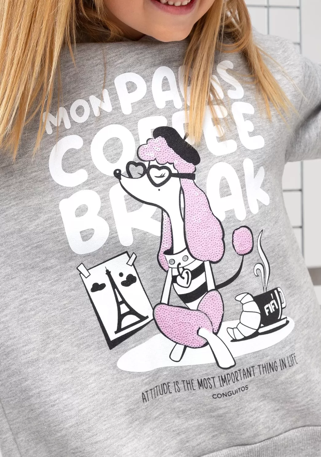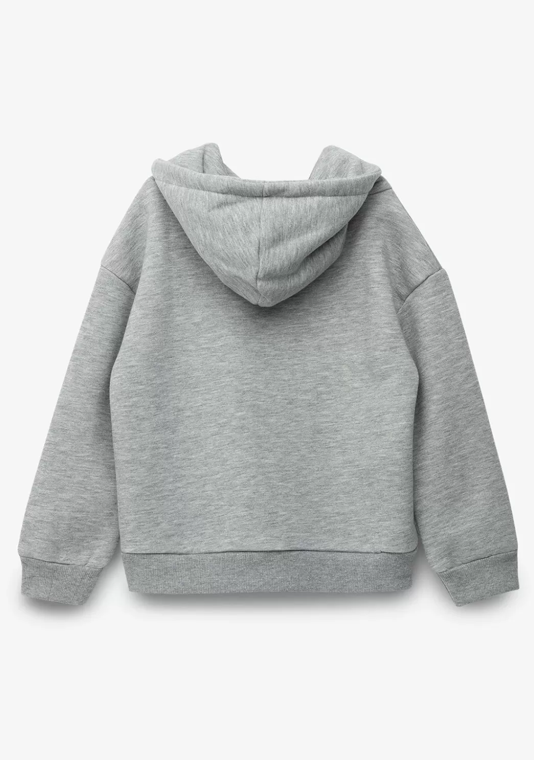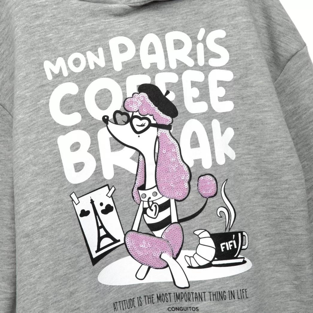 Sudadera de niña con capucha gris de algodón polar. Sus detalles como lentejuelas rosas. Esta sudadera tiene el interior afelpado y las mangas con acabado de puño para aislar mejor del frío.