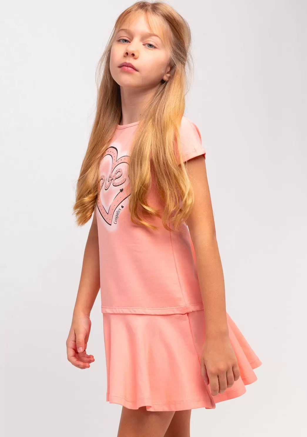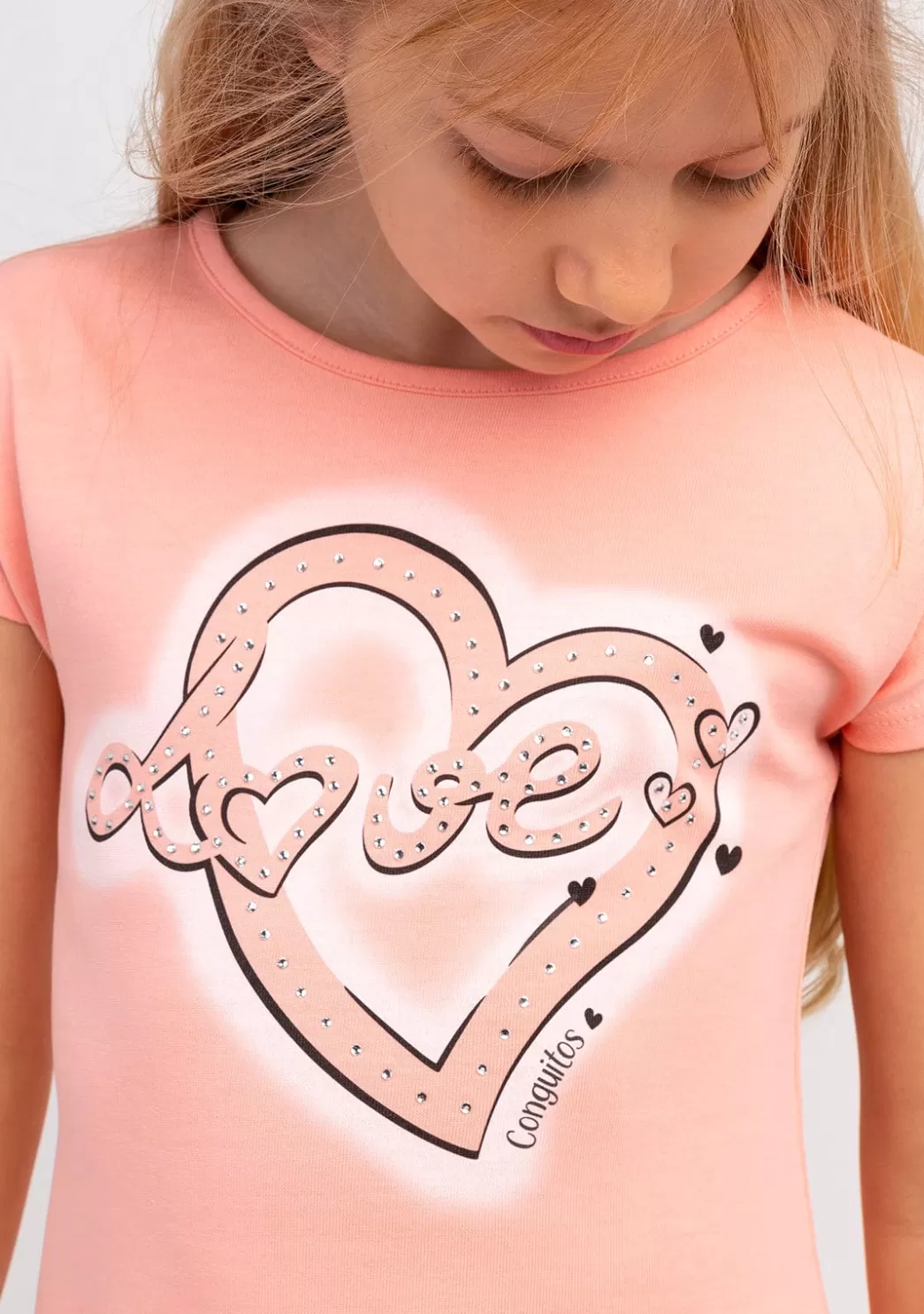 Vestido de niña en color naranja con el estampado «Love Heart» y volante en el bajo. Este vestido de manga corta es de algodón 100% con cuello redondo y falda con vuelo, vestido cómodo y sencillo para los días de verano.