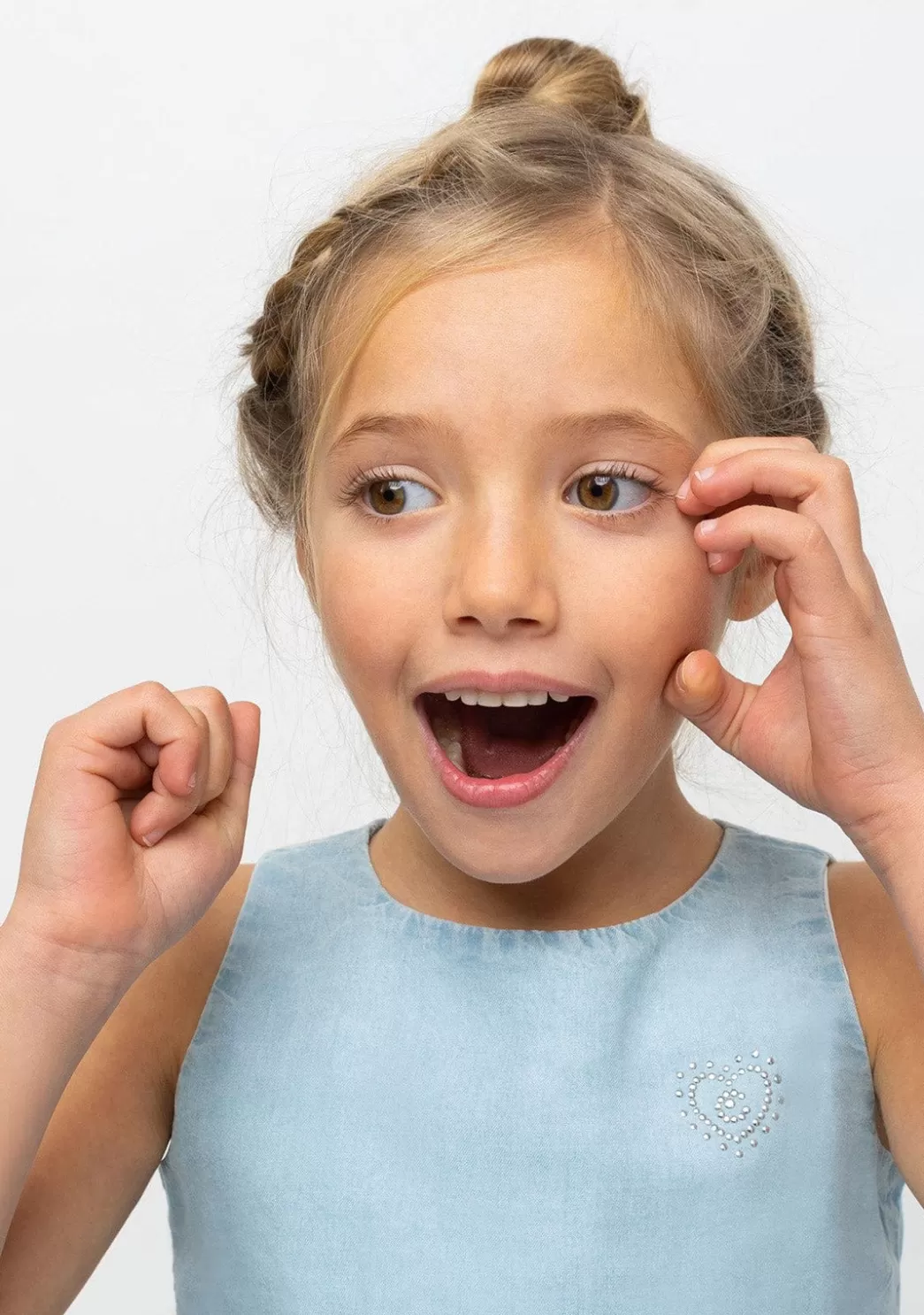 Vestido de tirantes de niña fabricado en tencel de color azul denim o vaquero con falda de volantes. Este vestido tiene 3 volantes, donde el del centro de color blanco tiene detalles de troquel en forma de flores, en el pecho tiene como detalle de strass el logo de Conguitos en forma de corazón. Este vesido junto a unas bailarinas es perfecto para eventos como comuniones o bautizos.