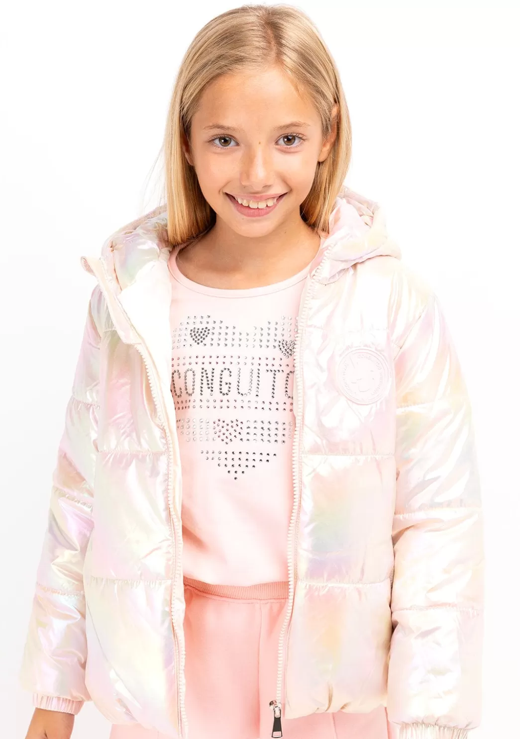 Camiseta de manga larga para niña confeccionada en algodón. Cuello redondo y mangas rectas. Maxi corazón de strass en el centro.