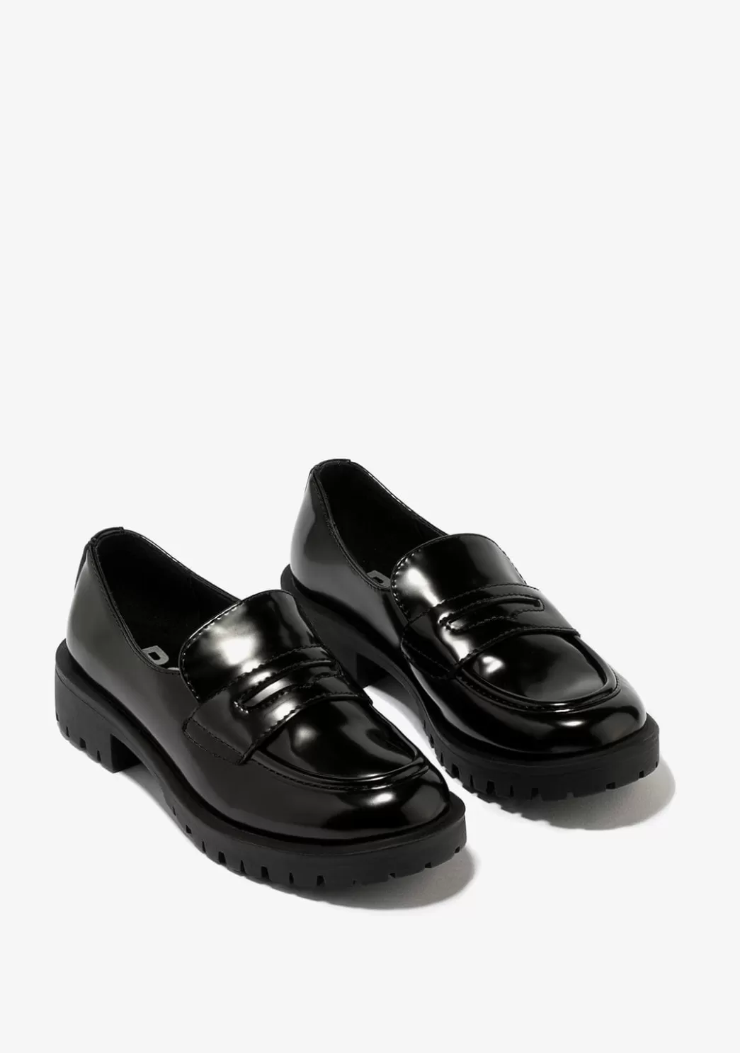 Zapato para niña en antic negro, tipo mocasín con detalle de antifaz y ribete en el corte. Suela de goma dentada estilo track.