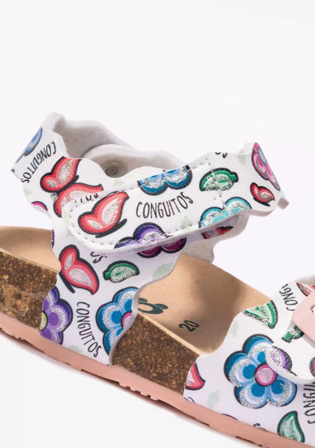 Sandalias de bebé estilo BIO en color blanco. Confeccionadas en material ligero. Cierre de tira adherente ajustable que aporta gran sujeción y comodidad en el tobillo y cierre de hebilla regulable en la parte frontal. Estampado de flores. La plantilla bio se amolda a la forma del pie. Suela de goma que mejora el agarre.