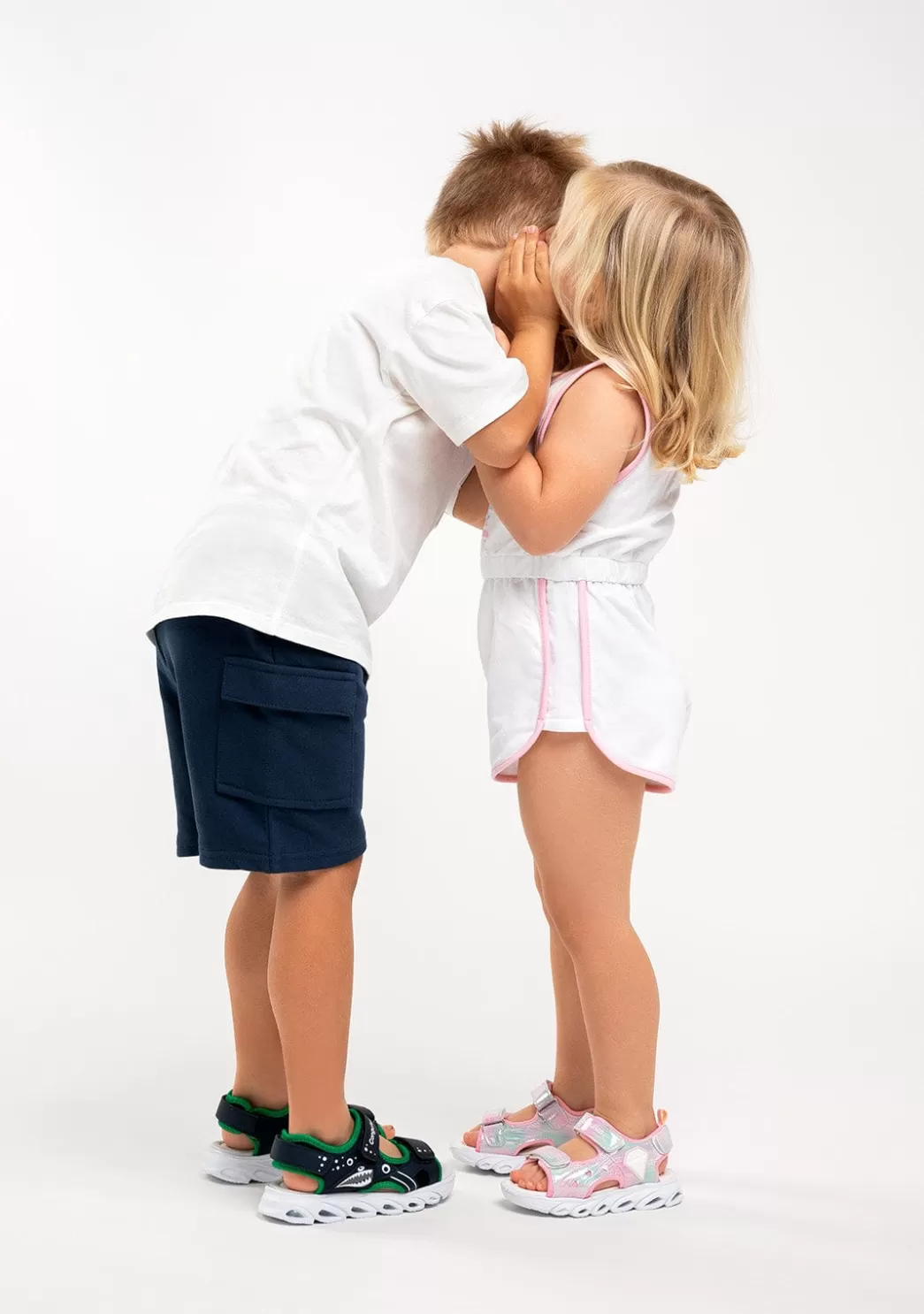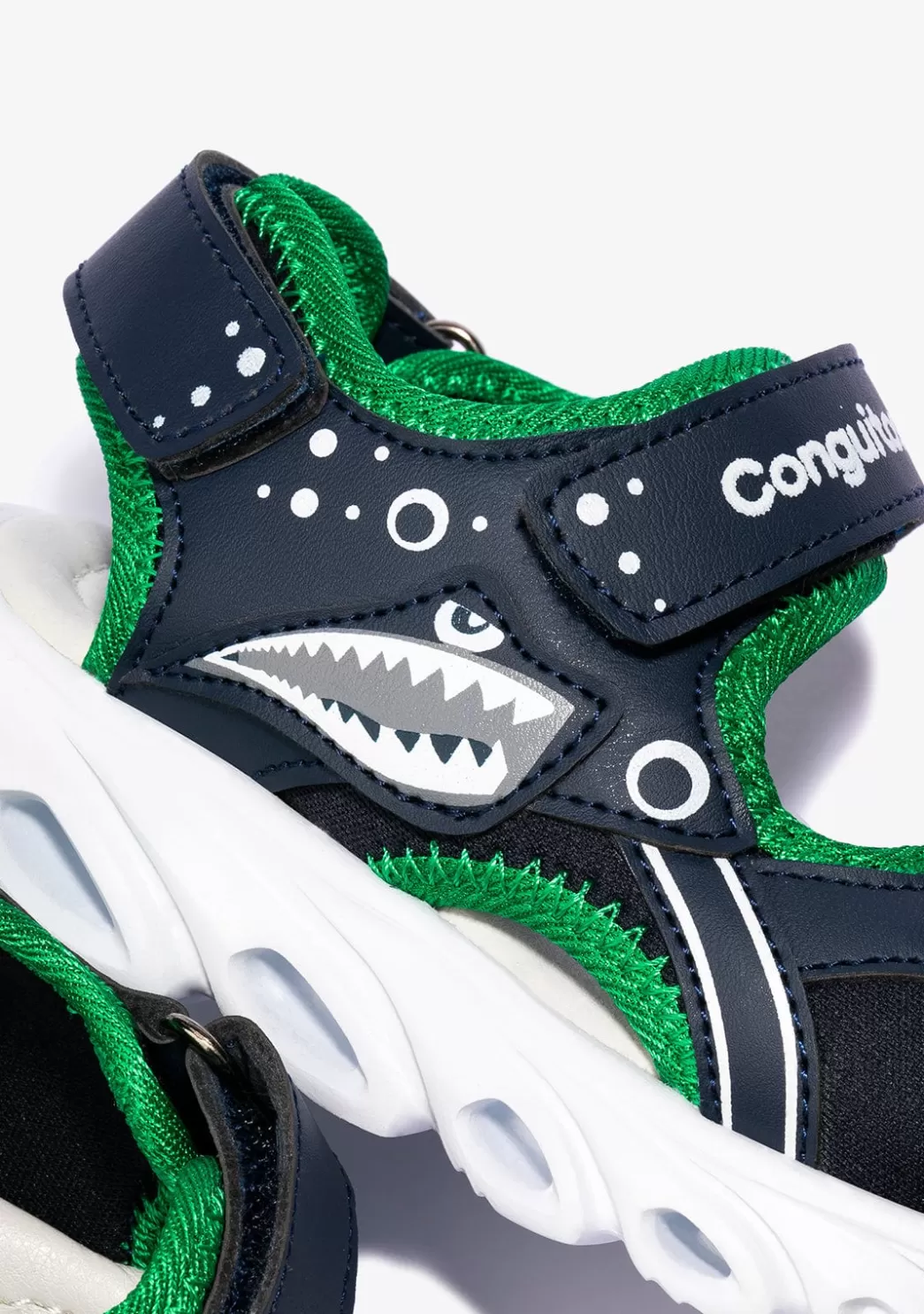 Sandalias deportivas unisex que se iluminan a cada pisada. Confeccionadas en napa. Tiras adherentes ajustables en parte frontal, también en el talón. Parche de tiburón en el lateral. Suela de goma que mejora el agarre y aporta comodidad.