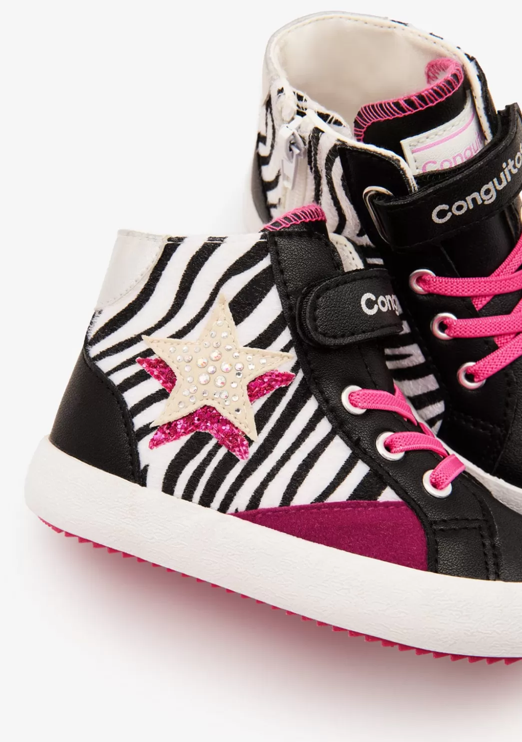 Zapatillas deportivas de caña alta con acabado oscuro, estampado de cebra y detalle de estrella en el lateral.Están confeccionadas en ante sintético y cuentan con una plantilla textil.