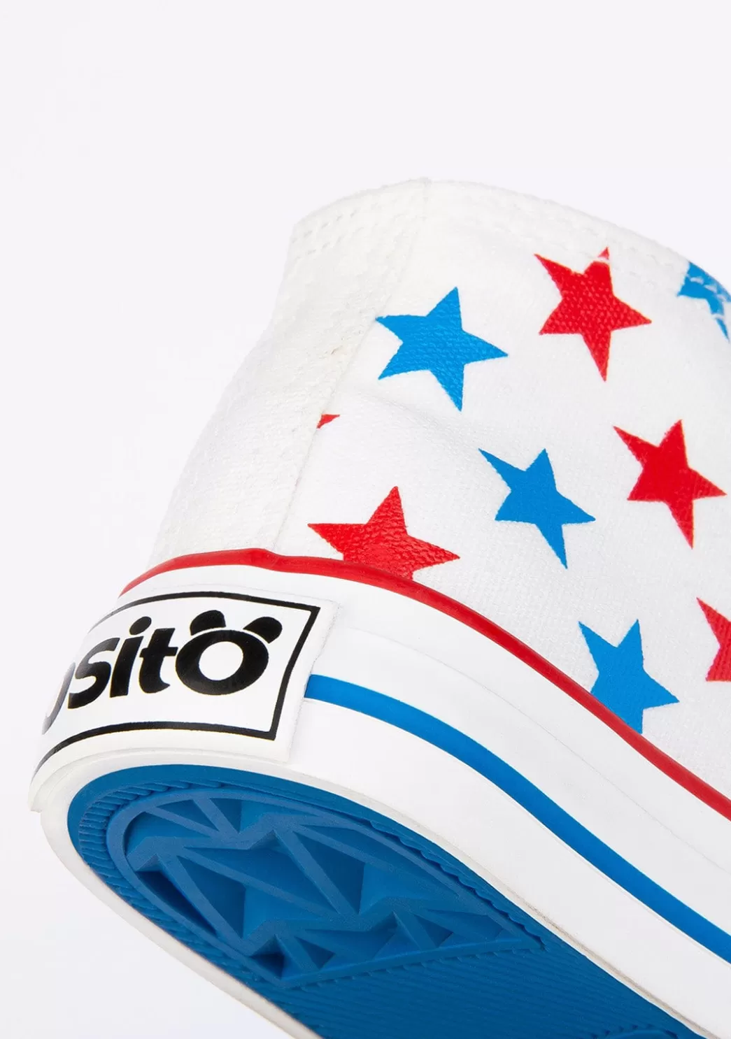 Zapatillas altas de lona con cordones. Tiene detalle de cremallera en el lateral de la bota. También tiene suela de goma que garantiza la flexibilidad y puntera reforzada para una mayor protección de los dedos. En estas nuevas zapatillas puedes ver el detalle de estrellas azules y rojas que harán que tu bebé se sienta como una superestrella.