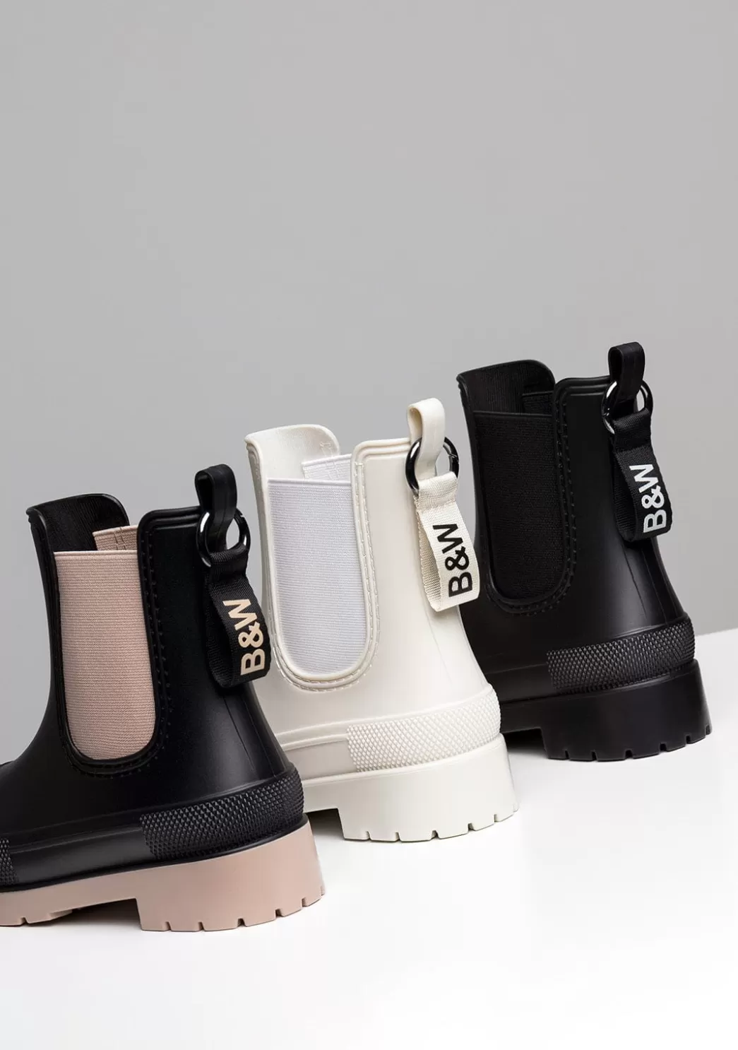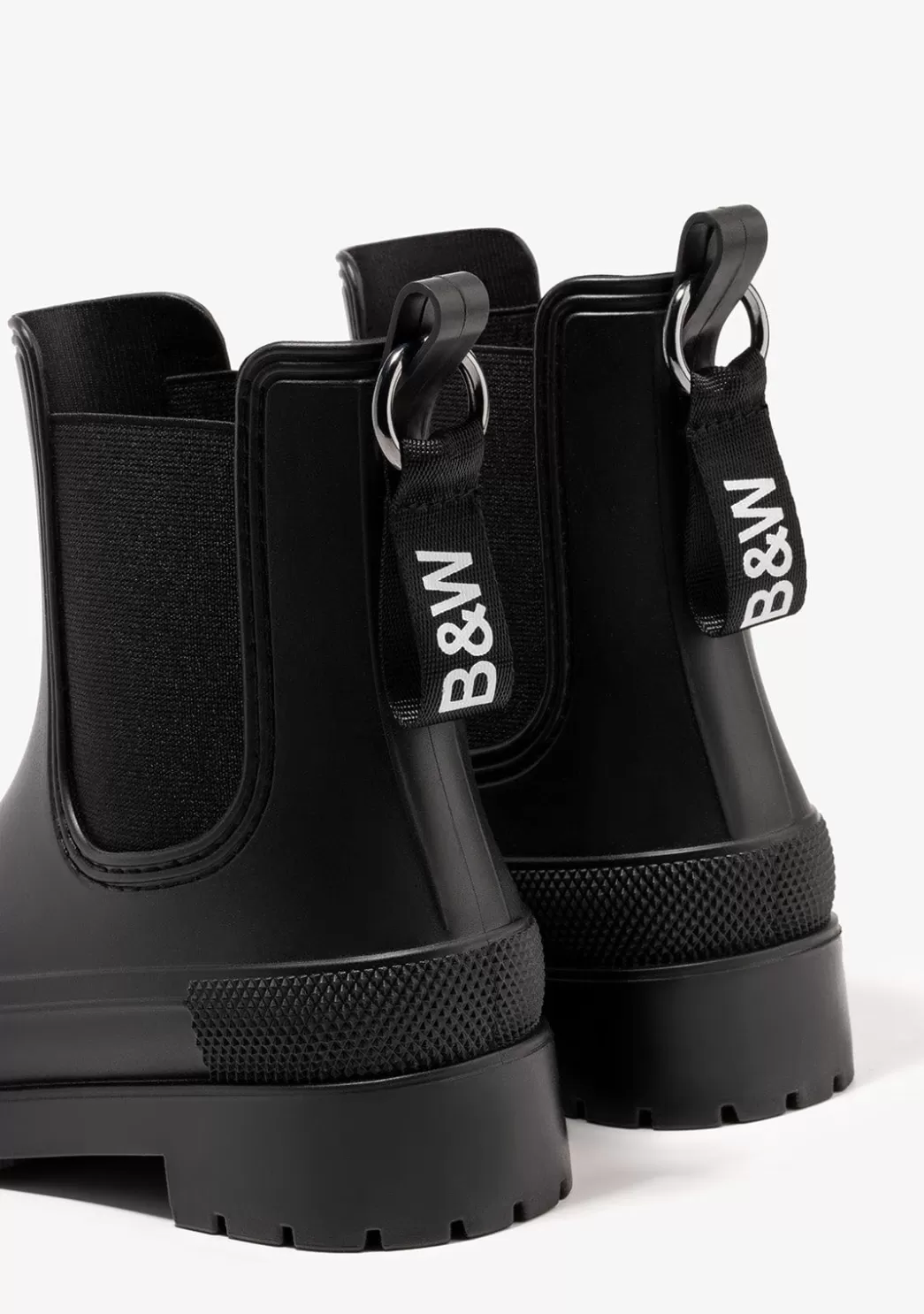 Botas de agua unisex. Confeccionadas en goma lo que las hace totalmente impermeables. Elásticos laterales que facilitan su puesta y la ajustan a la pierna aportando gran sujeción. Suela track para mejor agarre. Detalle trasero con el logo de B&W.