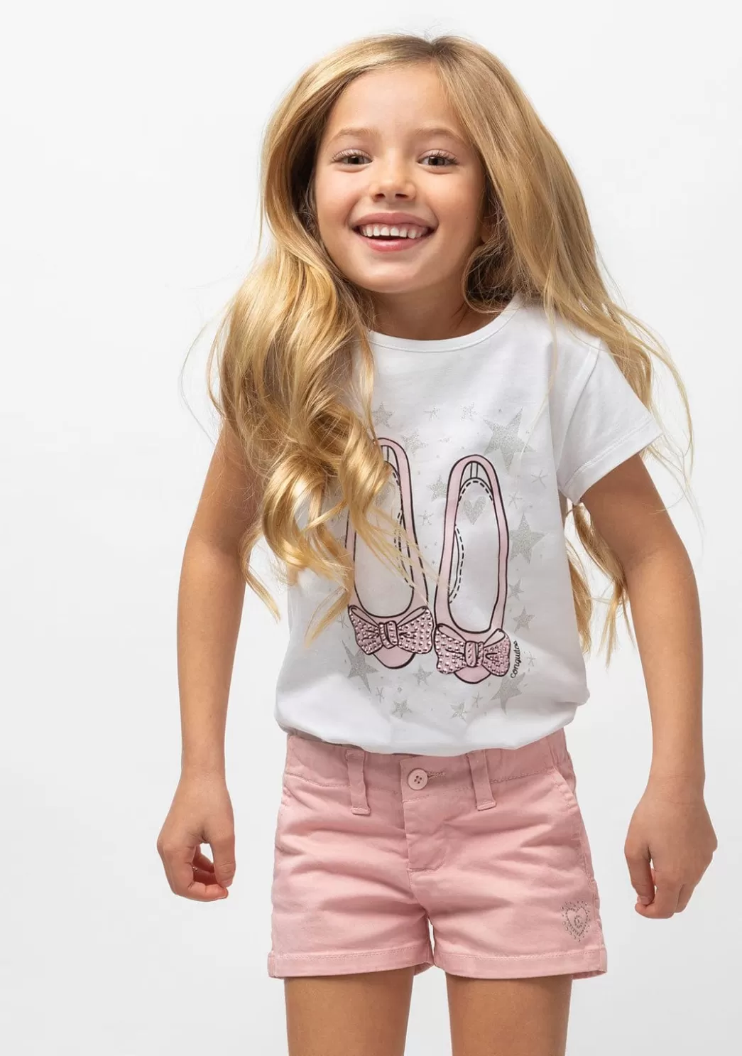 Camiseta de niña de color blanco confeccionada en algodón y spandex. Con diseño de bailarinas de color rosa con detalles de stras en el lazo. El dibujo está acompañado de estrellas y corazones en glitter de color dorado. Todo un básico ideal para esta época del año. También disponible el mismo diseño con las bailarinas en azul celeste.