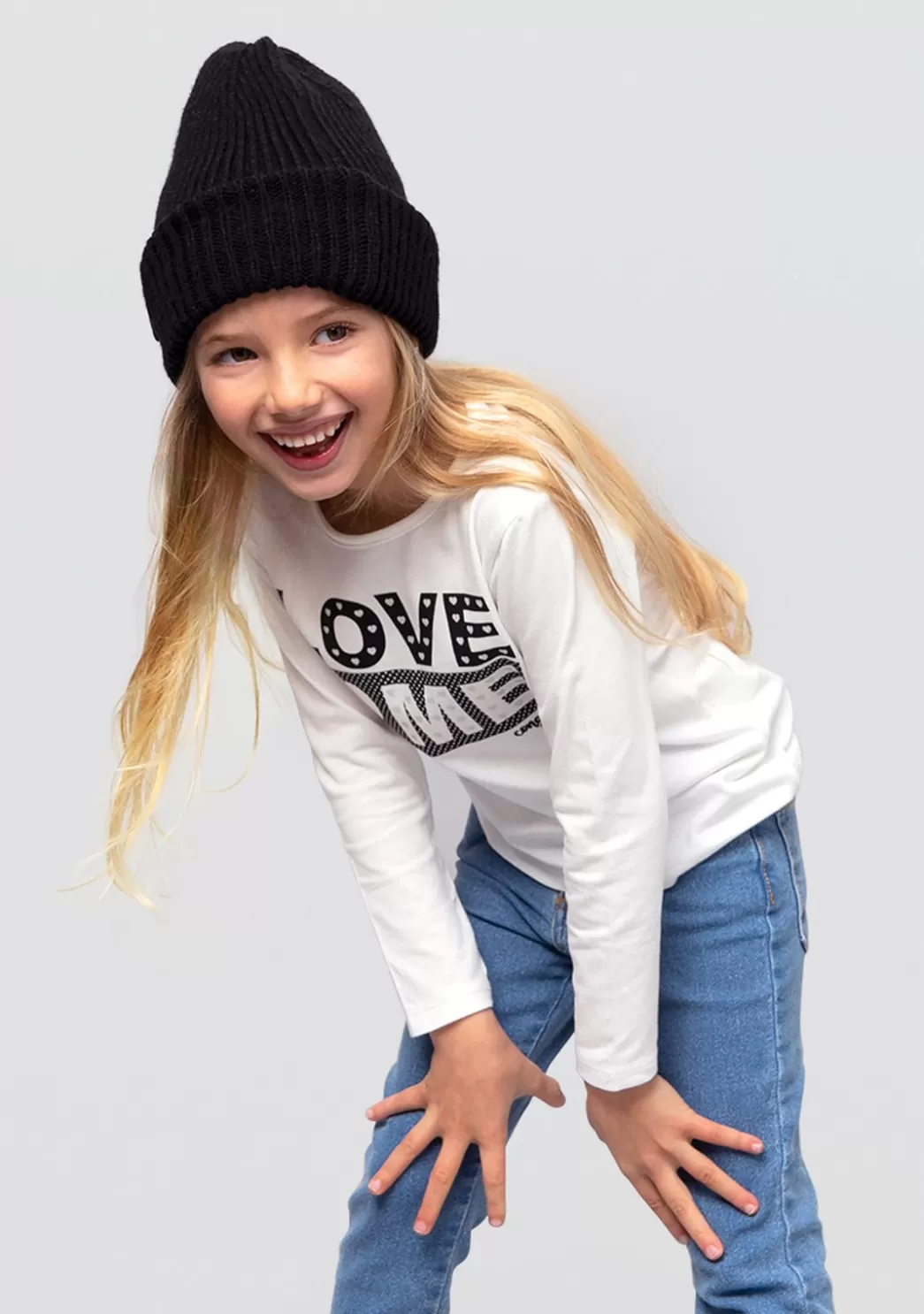 Camiseta de niña con luz de color blanco fabricada en algodón con print frontal. Dispone de luz en el corazón que acompaña a «Love Me» además de topos sobre el fondo negro y pequeños corazones de glitter plata con el logo de Conguitos en la parte inferior. ¡Las luces se activan con el movimiento! Disponible también en color rosa.