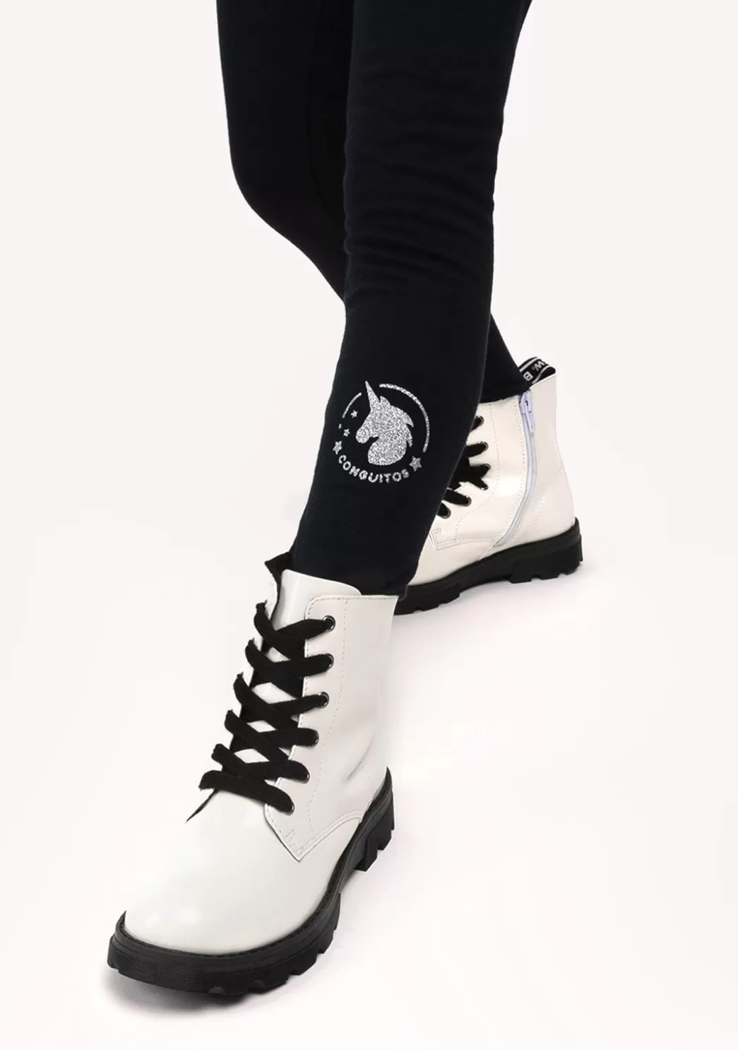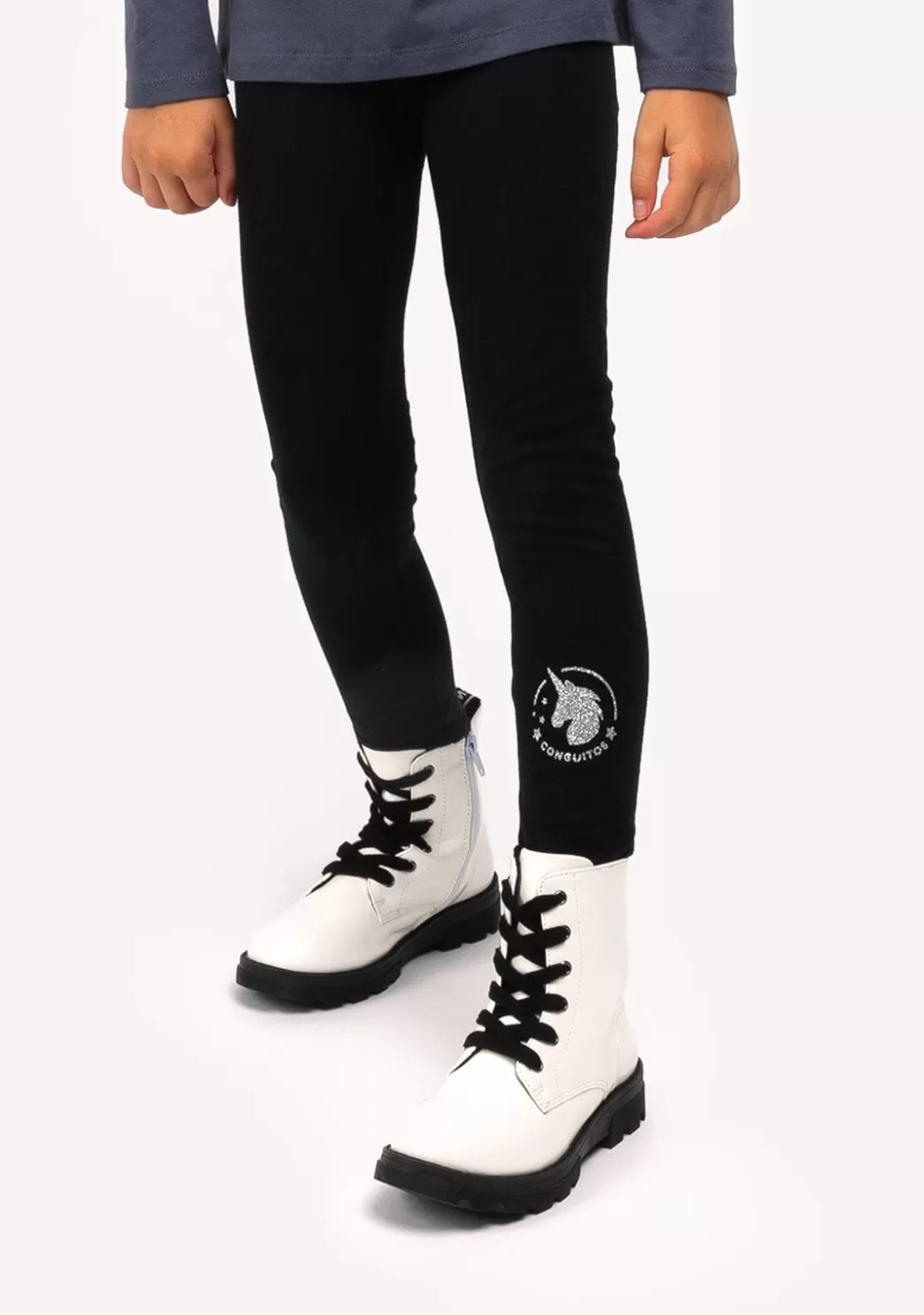 Leggings de niña de color negro fabricados en algodón con cintura elástica que facilita el ajuste y detalle en glitter de unicornio en la parte inferior del camal junto al logo de Conguitos. Para las amantes de los unicornios y la comodidad. Disponible en varios colores.